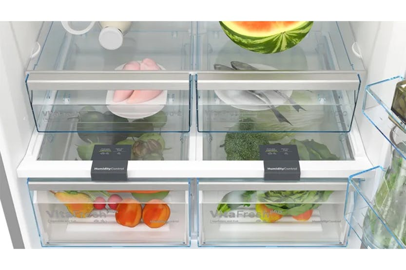 Upgrade your kitchen with the Bosch Series 4 Freestanding Fridge Freezer | KGN86VIEAG. With XXL capacity, LED lighting, and No Frost technology, this fridge offers ultimate storage flexibility, easy access to your food, and hassle-free maintenance. Perfect Fit design allows you to place it anywhere in your kitchen, while Individual Temperature Control lets you adjust settings to suit your needs. Say goodbye to manual defrosting and enjoy extra space for your favorite foods with the Big Box frozen food drawer. Get 10% back in Harvey Norman Gift Cards when you spend €500 or more on Large Appliances.