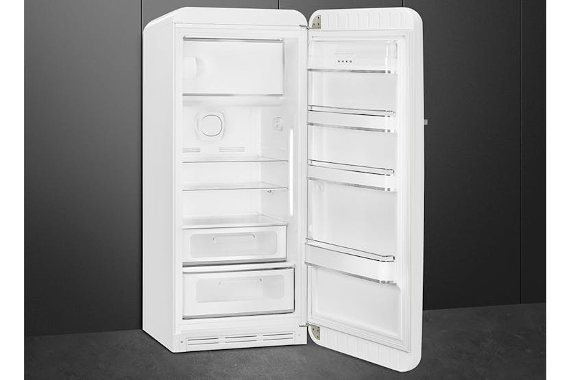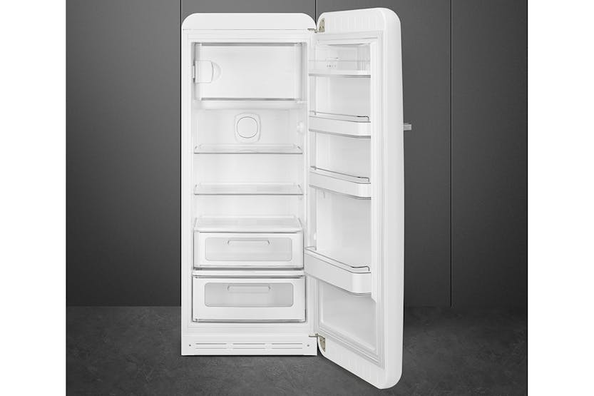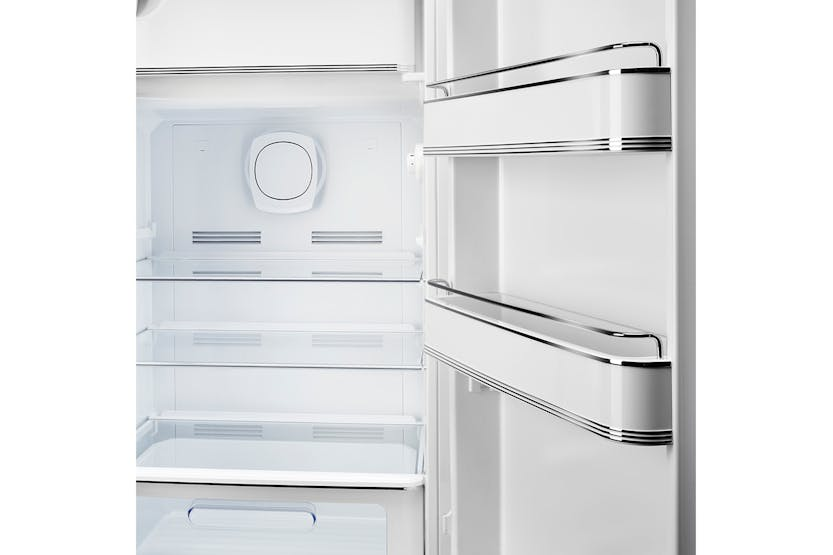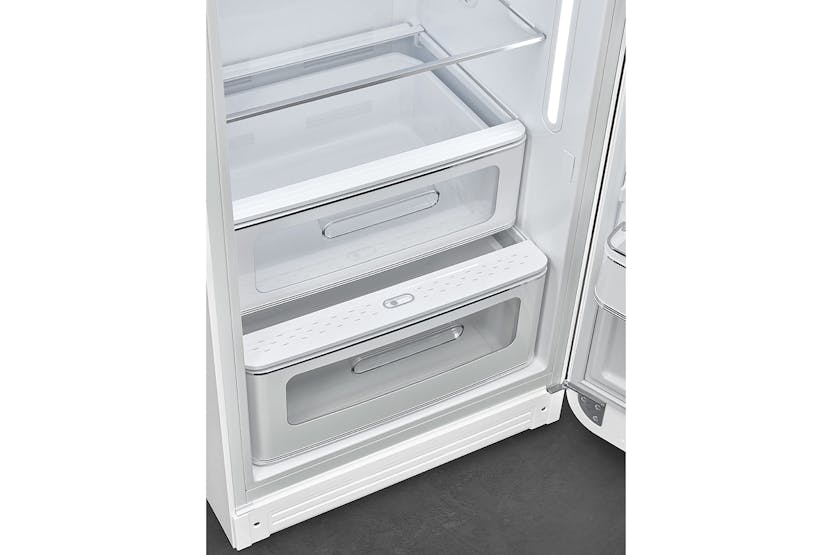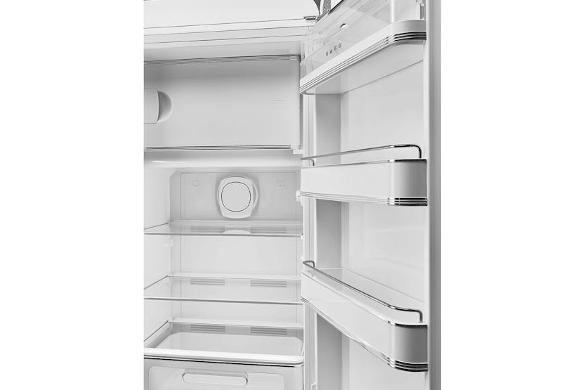 Upgrade your kitchen with the iconic Smeg 50's Style Freestanding Fridge Freezer in White. This cult favorite combines style and functionality with enriched interiors, rounded curves, and chrome details. The LED lighting, multiflow cooling system, and specialized drawers ensure optimal food storage while the elegant chrome finishes add a touch of retro charm to your space. With electronic temperature control and a sleek design, this fridge freezer is a must-have for any modern kitchen. Experience the perfect blend of style and innovation with the Smeg FAB28RWH5UK. Featuring a fan-assisted cooling system, static freezer, and Lifeplus 0°C drawer, this fridge freezer offers precise temperature control and longer food preservation. The elegant chrome finishes, rounded design, and gloss finishing add a touch of sophistication to your kitchen. Don't miss out on the opportunity to receive 10% back in Harvey Norman Gift Cards when you spend €500 or more on this Large Appliance.