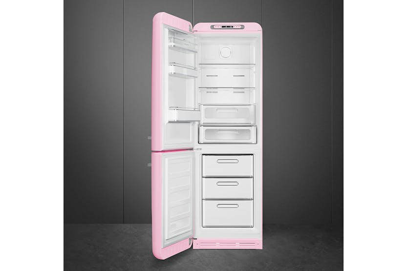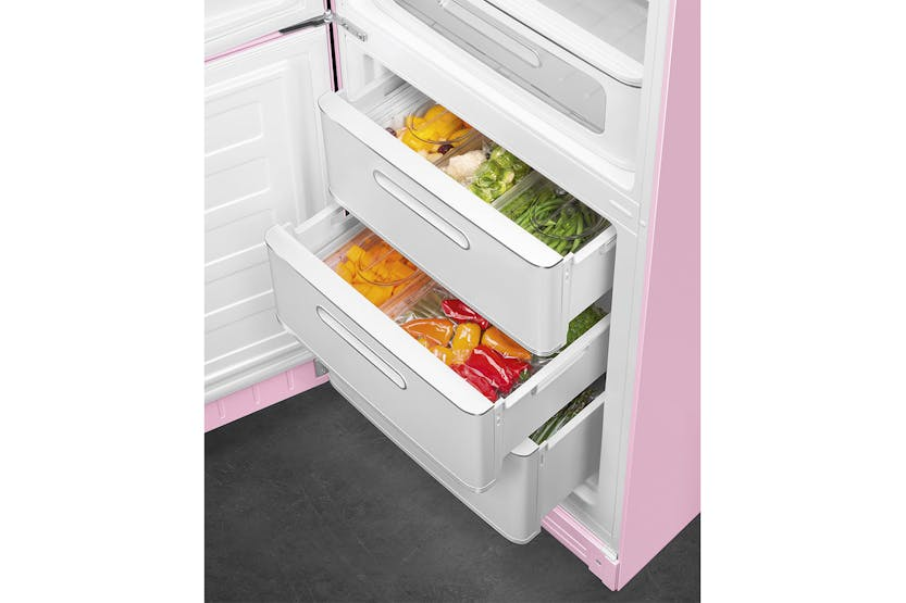 Add a touch of retro charm to your kitchen with the Smeg 50's Style Freestanding Fridge Freezer in Pink. The FAB32LPK5 not only stands out with its stylish design and elegant chrome finishes, but also offers practical features like a LifePlus 0°C Drawer for better food preservation, LED lighting for optimal visibility, and a No Frost system for hassle-free maintenance. With a generous capacity and digital LED display for precise temperature control, this fridge freezer is both a statement piece and a functional addition to your home. Take advantage of the Harvey Norman promotion and receive 10% back in Gift Cards when you spend €500 or more on Large Appliances, including the Smeg FAB32LPK5. Whether you're looking to upgrade your kitchen with a pop of color or simply want a reliable and efficient fridge freezer, this Smeg appliance combines style and performance to meet your storage needs with a touch of retro flair.