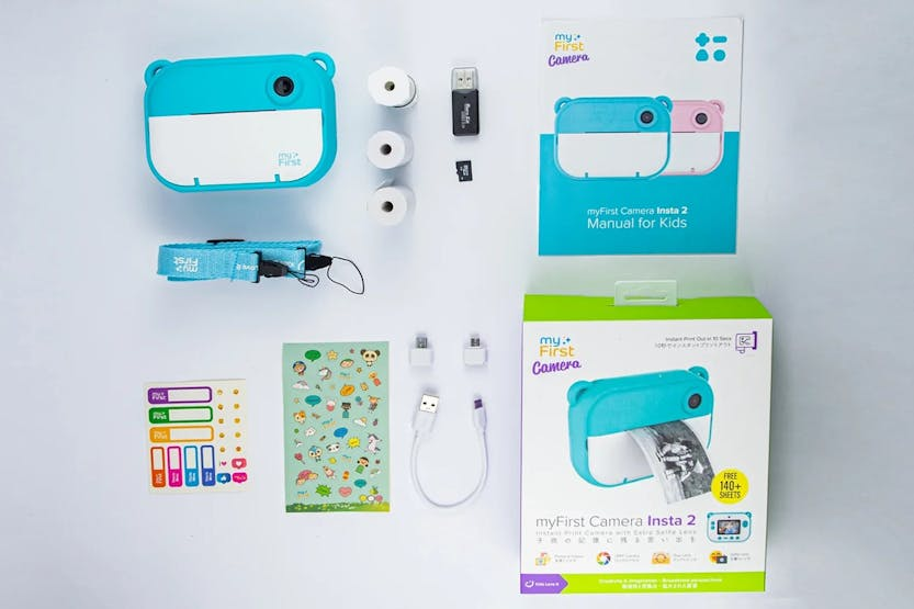 Capture precious moments with the myFirst Camera Insta 2 Instant Print Camera & Thermal Printer in Blue. This kid-friendly camera allows for instant printing in just 10 seconds, with sharp images and pre-loaded frames for added fun. The lightweight design, refillable thermal paper, and sticker rolls make it perfect for kids aged 4 to 13 to enjoy on vacations, family activities, arts and crafts projects, and more. With a 12MP front and selfie lens, dual lens capability, HD photo and video recording, and unlimited printing, the myFirst Camera Insta 2 offers endless entertainment for your child. The included thermal paper rolls, sticker paper, charging cable, and lanyard ensure your little one can easily capture and cherish memories all day long.