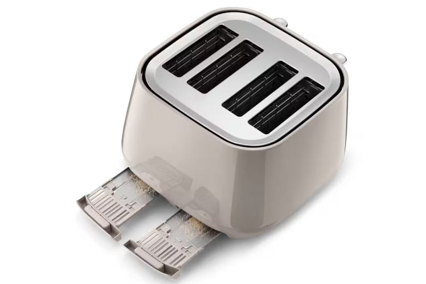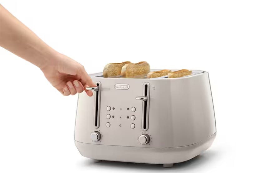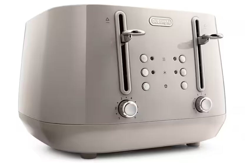 Add a touch of Italian style to your kitchen with the Delonghi Eclettica 4 Slice Toaster in Beige. This toaster features wide slots, progressive browning controls, and independent side operation for perfectly toasted bread, bagels, and crumpets. The electronic pre-set functions include defrost, reheat, and cancel, making it easy to create breakfast treats to everyone's liking. Keep your worktop neat and tidy with the removable crumb tray, and easily remove small slices with the exclusive extra-lift position. Upgrade your breakfast routine with this elegant and functional toaster. Celebrate your uniqueness and eclectic taste with the Delonghi Eclettica 4 Slice Toaster in Beige. With progressive browning controls, reheat and defrost settings, and independent controls for each side, you can toast to perfection every time. The sleek metal body adds an elegant touch to your kitchen, while the removable crumb tray ensures easy cleaning. Elevate your breakfast experience with this masterfully designed toaster that combines Italian style with modern functionality.