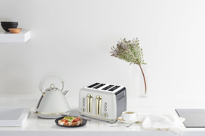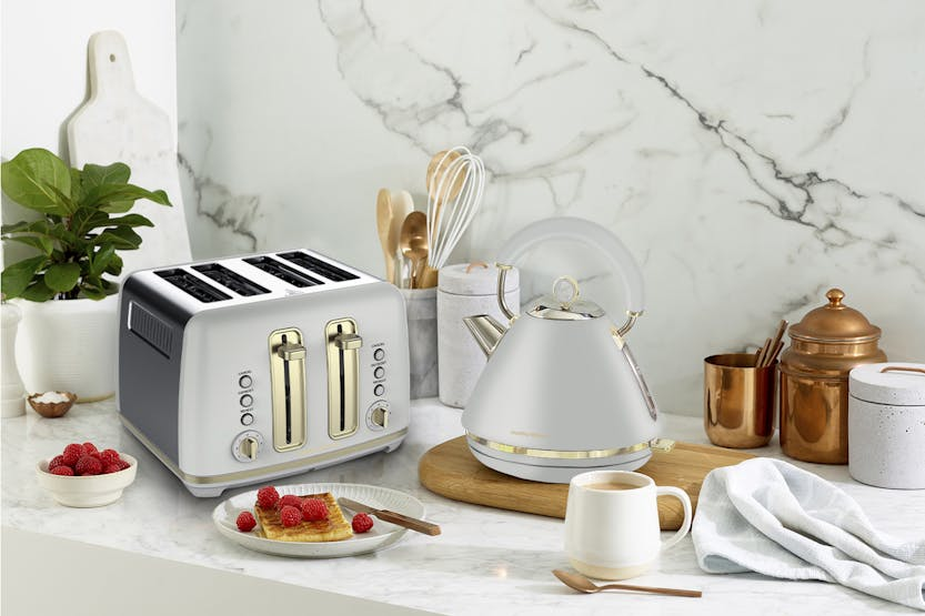 Upgrade your kitchen with the Morphy Richards Ascend 4 Slice Toaster in Grey & Soft Gold. This stylish toaster features independent operation for 2 or 4 slices, variable browning control, and convenient buttons for cancel, reheat, and defrost. The deep self-centering toasting slots ensure even toasting every time. With its warm colors and soft gold accents, this toaster will not only add practicality but also become a focal point in your kitchen. Each carton contains 3 pieces for your convenience. Elevate your breakfast routine with this sleek and functional toaster. The Morphy Richards Ascend 4 Slice Toaster in Grey & Soft Gold combines practicality with style. With its independent operation, variable browning control, and deep self-centering toasting slots, this toaster offers convenience and consistent results. The soft gold accents add a touch of elegance to your kitchen, making it a standout piece. Each carton contains 3 pieces, making it a great option for households or as a gift. Upgrade your kitchen with this modern and functional toaster today.