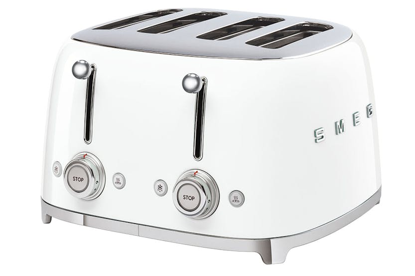 Upgrade your breakfast routine with the Smeg 50's Retro Style 4 Slice Toaster in White. This stylish toaster features six browning levels and three pre-set programmes for reheating, defrosting, and bagel toasting. With 4 large slots and self-centering racks, it ensures even toasting for slices of any size. The toaster also includes practical optional accessories like sandwich racks and bun warmers, making it a versatile addition to your kitchen. With anti-slip feet, a built-in cord wrap, and a stainless steel body, this toaster combines style and functionality seamlessly. The Smeg TSF03 toaster is designed to meet your everyday needs with its powerful 2000W operation, easy-to-clean removable crumb trays, and illuminated control knobs. Its 2 independent control panels and large compartments make toasting a breeze, while the automatic pop-up feature ensures perfectly toasted slices every time. Elevate your breakfast experience with this iconic toaster that adds a touch of retro charm to your kitchen.
