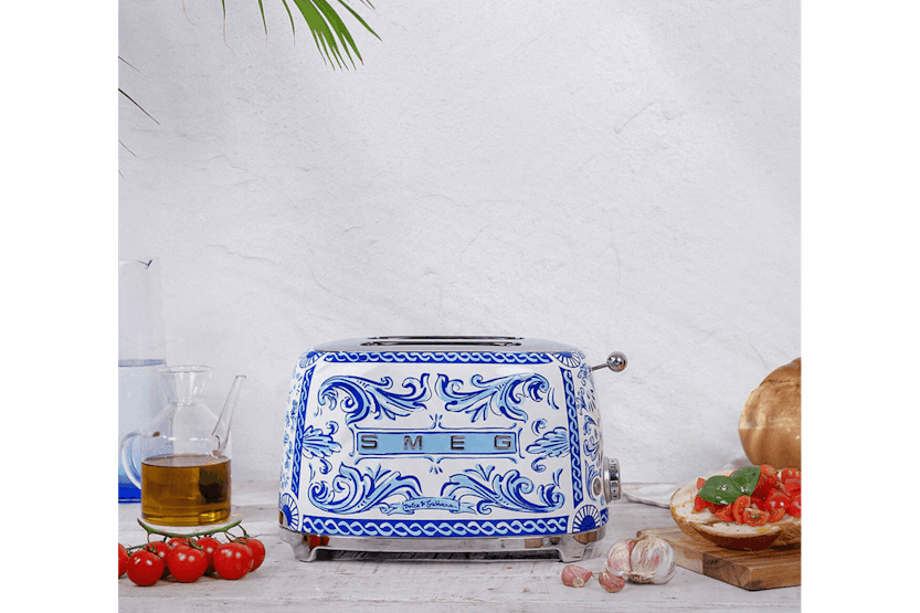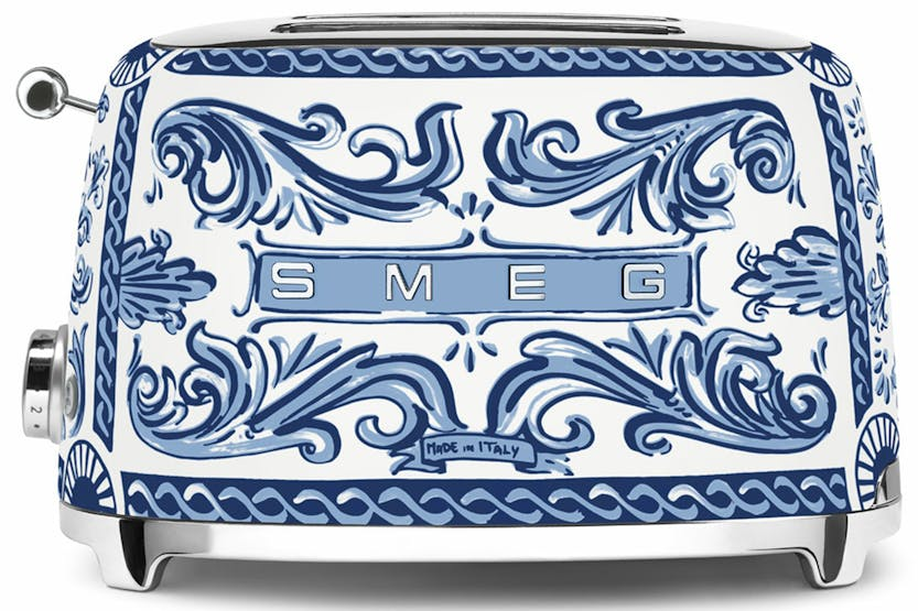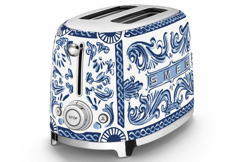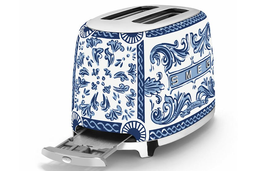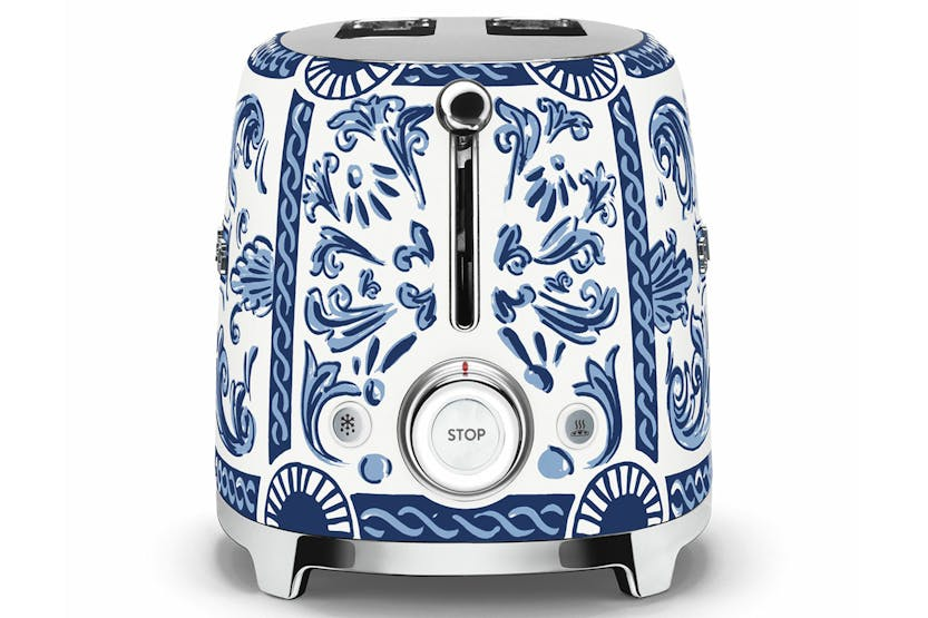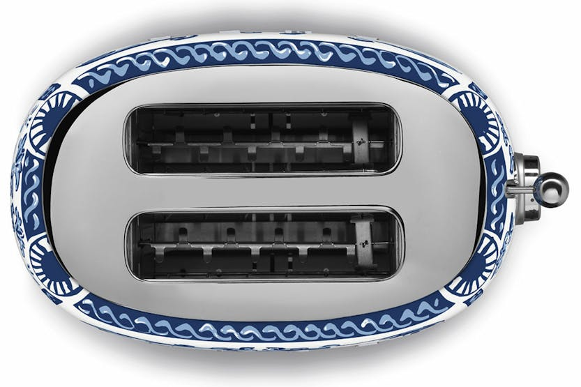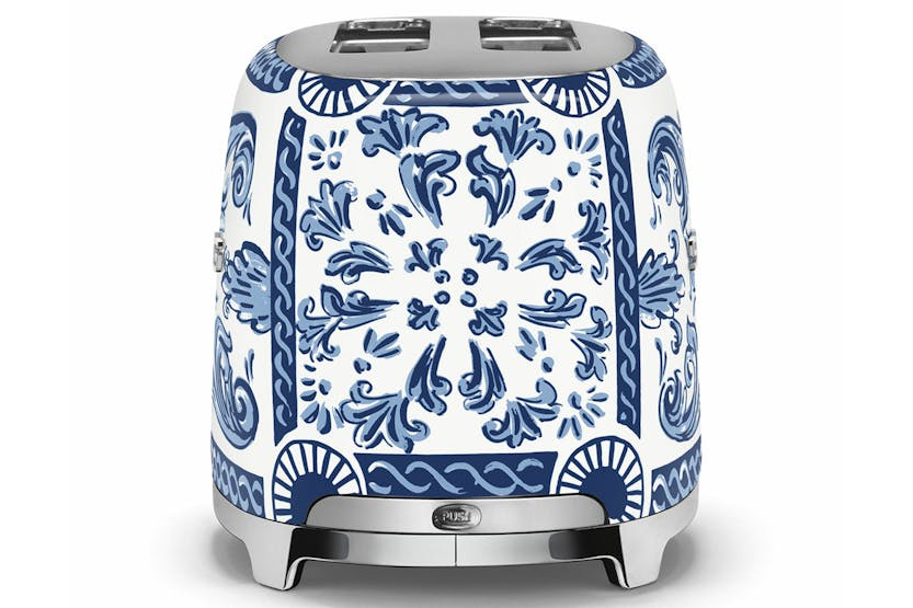 Transport yourself to the serene shores of the Mediterranean with the Smeg 50's Retro Style Dolce & Gabbana 2 Slice Toaster. Adorned with a deep blue and white maiolica print inspired by Sicily, this toaster features multi-function controls for reheat, defrost, and bagel options. The large compartments with self-centering racks ensure even toasting, while the automatic pop-up feature adds convenience. With 6 toasting levels and practical optional accessories available, this toaster offers versatility and style in a compact design. Crafted with a polished chrome top and stainless steel body, this collaboration between Smeg and Dolce&Gabbana brings both fashion and function to your kitchen. The toaster's wide slots with automatic centering, along with its defrost, reheat, and bagel functions, cater to different types of bread and individual preferences. Experience ultimate comfort with the automatic slices popup feature, while the convenient crumb tray simplifies the cleaning process. Elevate your breakfast routine with this stylish and practical toaster that combines Italian design with innovative technology.