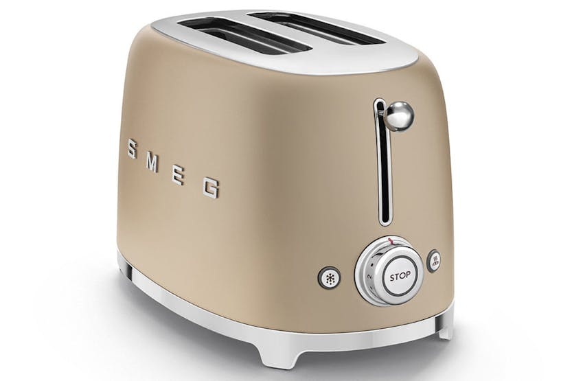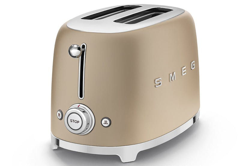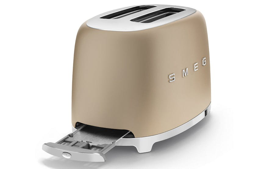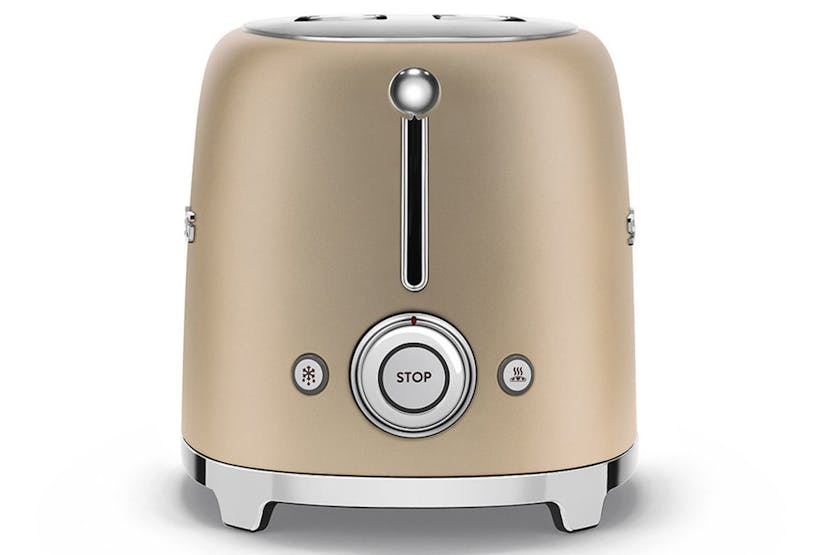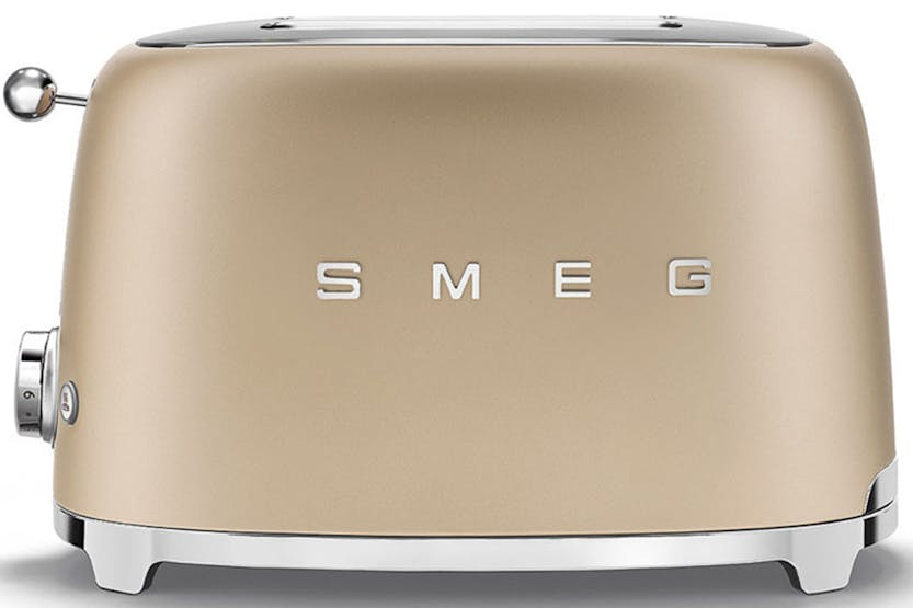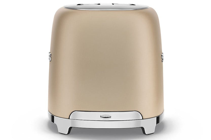 Introducing the Smeg 50's Style 2 Slice Toaster in Matte Champagne Gold. This sleek and luxurious toaster features multi-function controls for reheating, defrosting, and toasting bagels, along with large compartments for even toasting. With optional accessories like sandwich racks and bun warmers, this toaster is both practical and stylish, perfect for adding a touch of fun and sophistication to any kitchen. Crafted with a stainless steel body and illuminated control knobs, the Smeg 2 Slice Toaster combines functionality with a trendy matte finish. The integrated cord, backlit buttons, and sliding lever make for easy use, while the unique design and high-quality construction make it a standout addition to any kitchen. Elevate your breakfast routine with the Smeg 50's Style Toaster in Matte Champagne Gold.