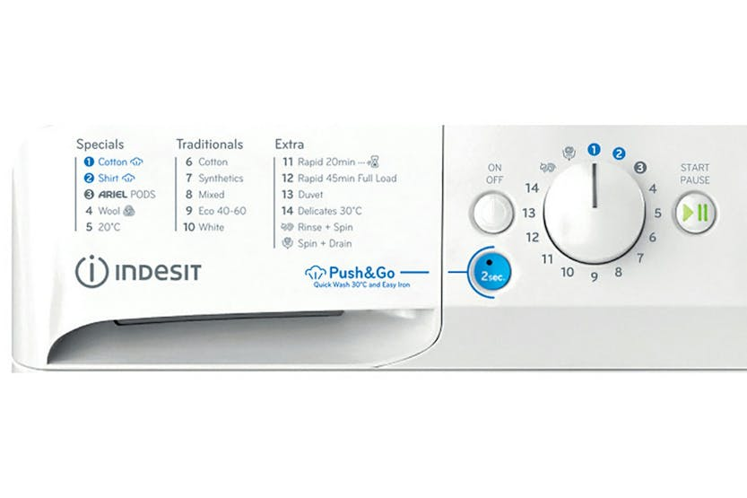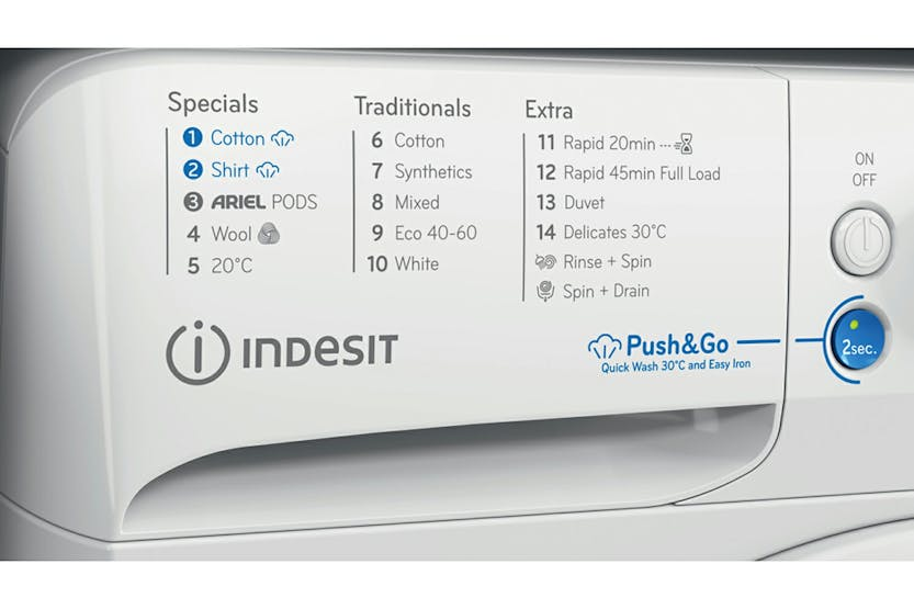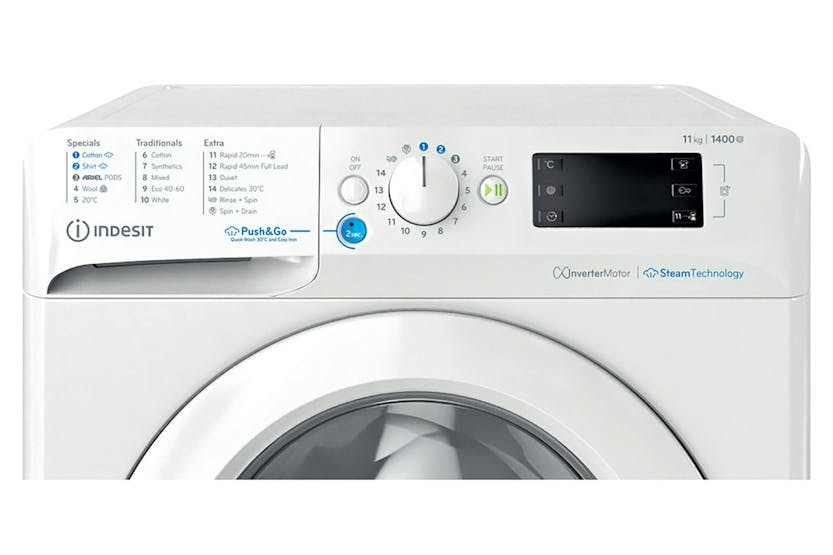 Keep your family's laundry under control with the Indesit 11kg Freestanding Washing Machine | BWE111496XWVUK. Featuring innovative Push&Go with Steam Technology to soften clothes and reduce creases, as well as the Ariel PODS cycle for brilliantly clean clothes in just one hour, this energy-efficient washing machine is designed to make laundry quick and easy. With rapid cycles, Inverter Motor for improved efficiency, and Water Balance Plus to minimize wastage, this washing machine offers unparalleled performance while saving you money on energy bills. Experience the convenience of scheduling your laundry with the delay option, while the keylock feature ensures safety and prevents accidental use. With programs for cotton, wool, duvets, and more, as well as a progress indicator and automatic programs, the Indesit washing machine is a reliable and efficient solution for all your laundry needs.
