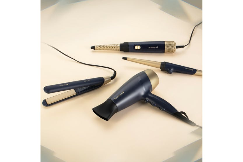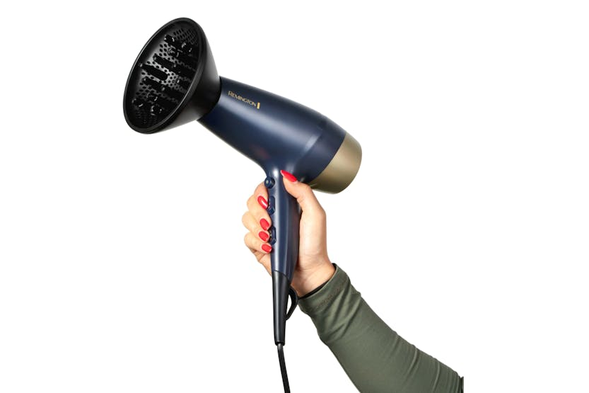 Achieve smooth, shiny hair with the Remington Sapphire Luxe Hair Dryer in Deep Navy/Champagne. The advanced ceramic coated grille infused with sapphire helps reduce static and flyaways, while the powerful 2200W motor offers fast drying without excessive heat. With three heat and two speed settings, this stylish hair dryer is a must-have for your beauty routine.