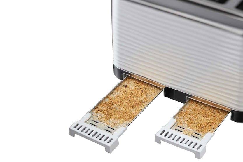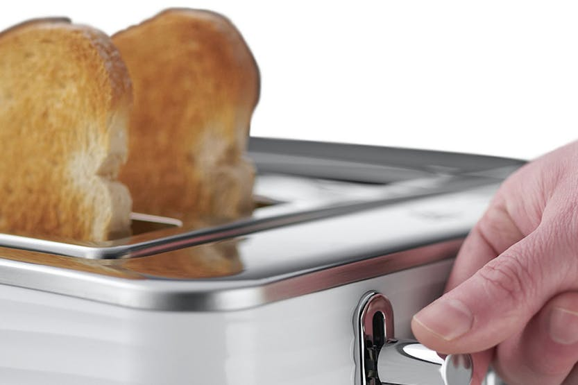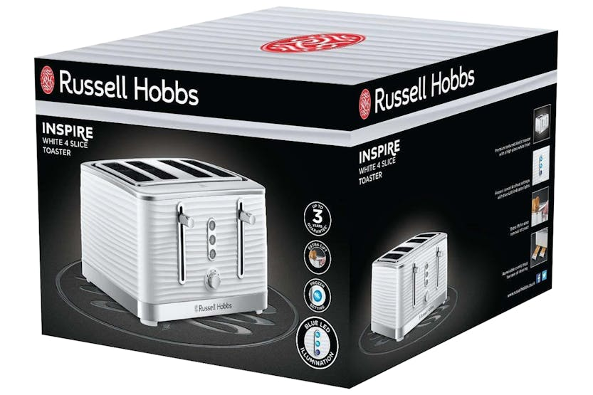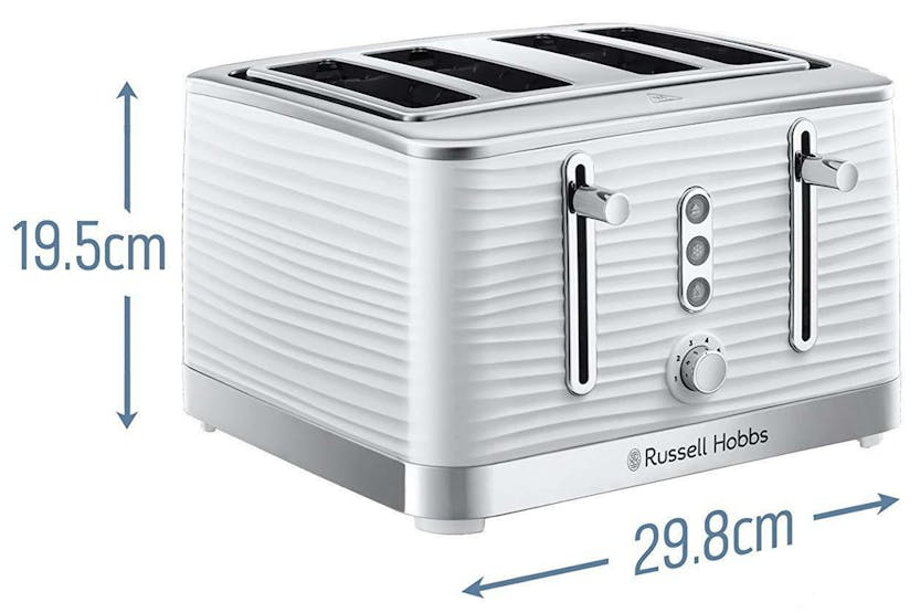Enhance your kitchen with the Russell Hobbs Inspire 4 Slice Toaster in white. This stylish toaster features a unique design with textured ripples, 4 large slots for breakfast bonding, and convenient functions like frozen, cancel, and reheat settings. The high lift feature and blue LED illumination add both convenience and style to your kitchen, making breakfast preparation a breeze. Elevate your mornings with this sleek and practical toaster from Russell Hobbs.