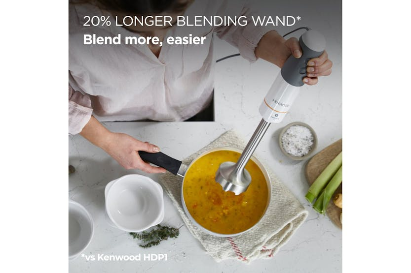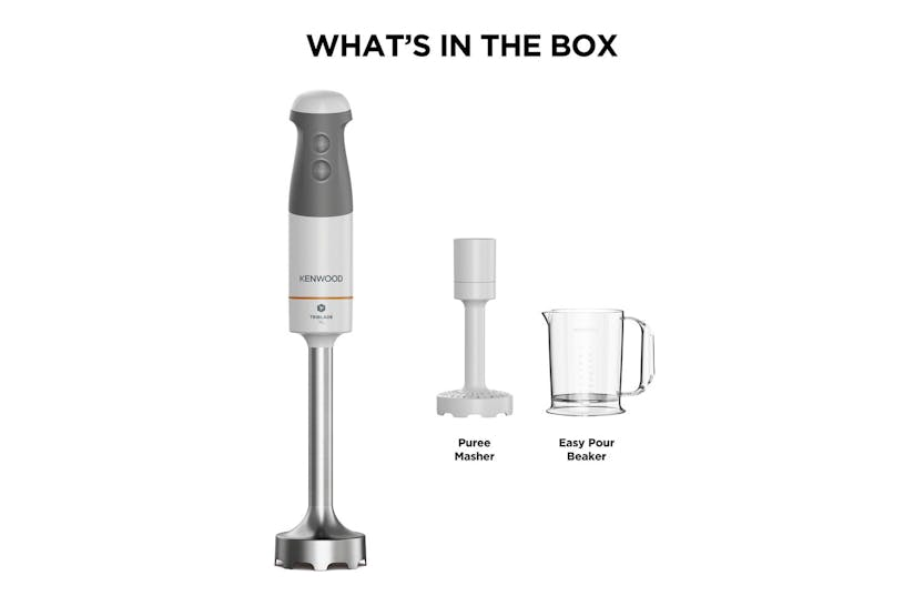 The Kenwood Triblade XL Hand Blender | HBM40.004WH in white offers superior blending performance with its Triblade XL blending wand and essential accessories for versatile kitchen creativity. The 35% wider foot allows for faster blending and finer results, perfect for quick meals or batch cooking. With a powerful 850W motor and dishwasher-safe tools, this hand blender is designed for efficiency and ease in every use. Experience the convenience of the Triblade XL Hand Blender with its mash tool for fluffy mashed potatoes, longer blending wand for batch prep, and Suregrip touchpoints for comfortable handling. The Turbo Charged motor ensures 40% more power to blend through tough ingredients, while the Triblade Technology guarantees consistent blending results. Make the most out of one appliance with the easy twist attachment feature, and enjoy the practicality of dishwasher-safe tools for effortless cleaning after use.