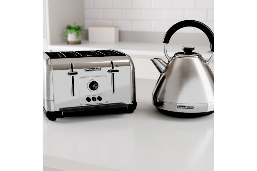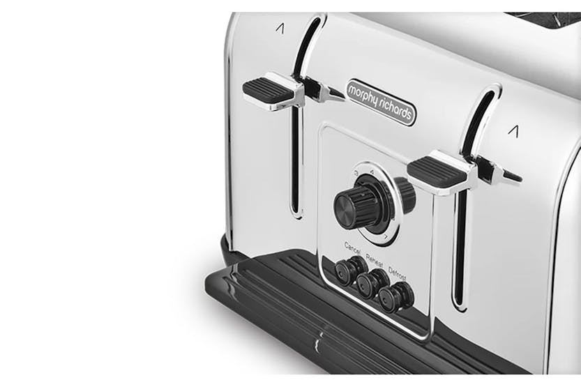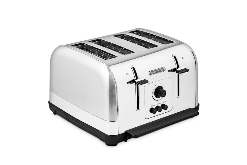 Enhance your kitchen with the Morphy Richards Venture 4 Slice Toaster in sleek stainless steel. This toaster combines classic retro design with modern functionality, featuring four slots, seven browning controls, reheat settings, high lift levers, and a removable crumb tray for easy cleaning. Make toast just the way you like it, from lightly toasted to crunchy perfection, with this stylish and practical addition to your countertop. Say goodbye to messy worktops and hello to perfectly toasted bread every time. Upgrade your breakfast routine with the Morphy Richards Venture 4 Slice Toaster. With its elegant stainless steel finish and convenient features like variable browning controls, reheat settings, high lift levers, and a removable crumb tray, this toaster is both stylish and functional. Say goodbye to unevenly toasted bread and messy countertops, and hello to perfectly toasted slices every time. Elevate your kitchen with this classic yet modern appliance that is sure to make a statement in your home.