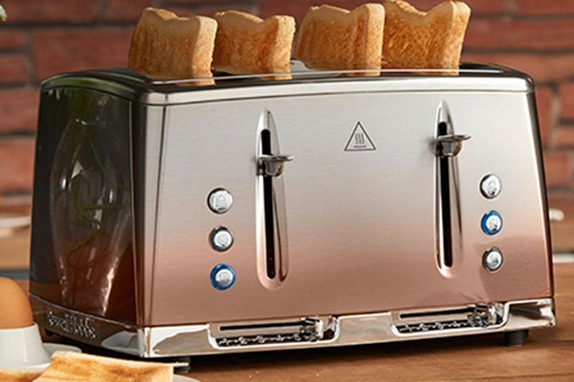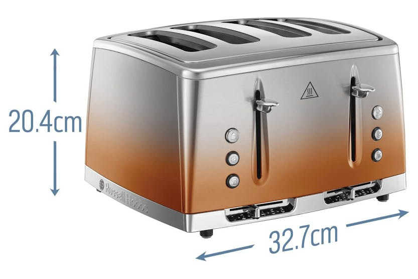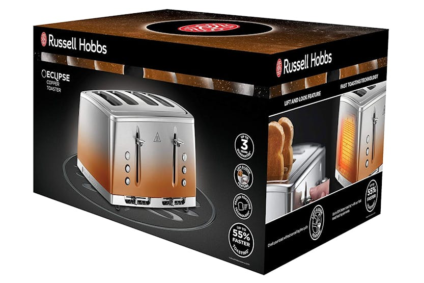Introducing the Russell Hobbs Eclipse 4 Slice Toaster in Copper Sunset. This stunning toaster combines advanced features with a unique eclipse effect design, adding a touch of style to your kitchen. With variable browning control, fast toasting technology, and smart features like lift and look, this toaster ensures your toast is perfect every time. Enjoy up to 55% faster toasting with the Eclipse Copper 4 Slice Toaster. Its extra-wide slots and high lift feature make it versatile for different types of bread, while the removable crumb tray keeps your kitchen clean and tidy. Upgrade your breakfast routine with this stylish and efficient toaster.