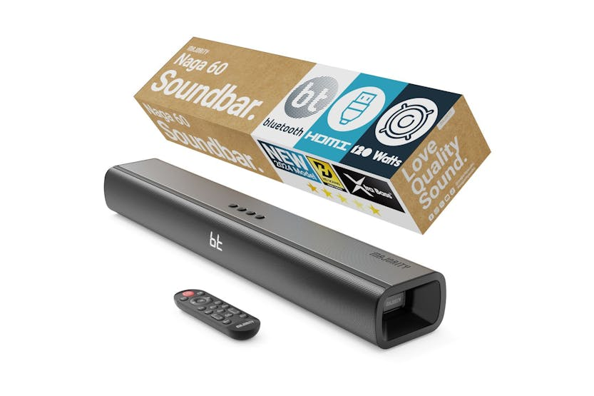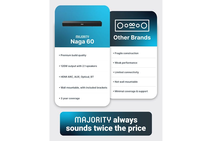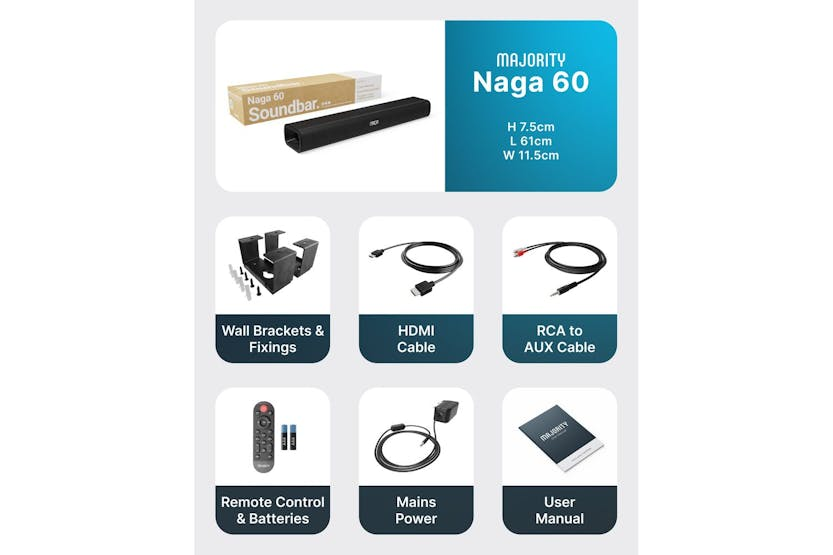 Enhance your home entertainment experience with the Majority Naga 60 2.1 Bluetooth Soundbar, delivering powerful 120 Watts of audio quality. Immerse yourself in a captivating soundscape, complete with deep bass from the built-in subwoofer, dynamic EQ controls, and 3D Surround Sound. With Bluetooth 5.0, HDMI ARC, Optical Connections, and easy USB & AUX playback options, this soundbar offers seamless connectivity and exceptional sound performance. Elevate your audio setup with the sleek and versatile Majority Naga 60 Soundbar for a truly immersive entertainment experience.