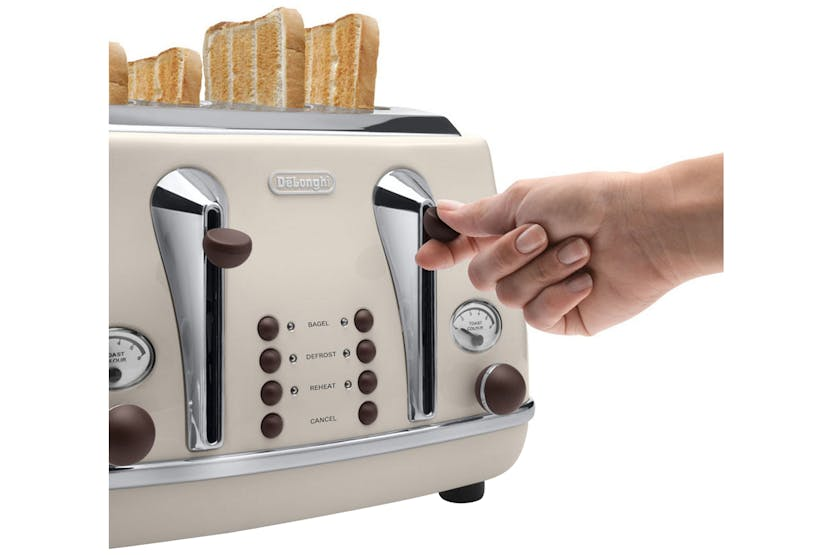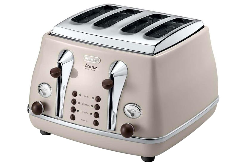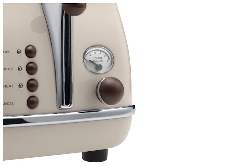 Enhance your kitchen with the stylish DeLonghi Icona Vintage 4 Slice Toaster in beige. This toaster features a high gloss finish with chrome detailing, variable browning control, and multiple functions like bagel and defrost. The extra lift position and removable crumb trays make cleaning and toasting small slices a breeze. Elevate your breakfast routine with this elegant and functional toaster. Achieve your perfect toast every time with the DeLonghi Icona Vintage 4 Slice Toaster. With its progressive electronic browning control, reheat function, and dual independent control panels, this toaster offers convenience and precision. The iconic design with soft colors and metallic accents adds a touch of sophistication to your kitchen, making it a must-have appliance for any modern home.