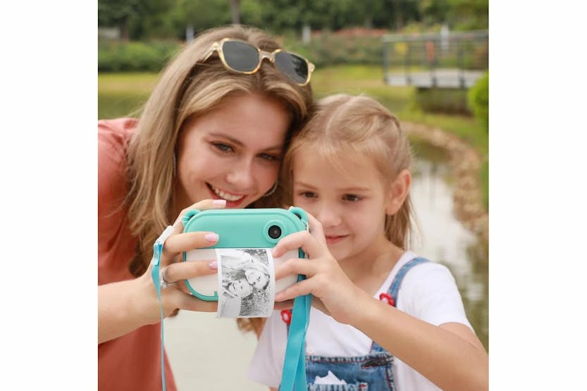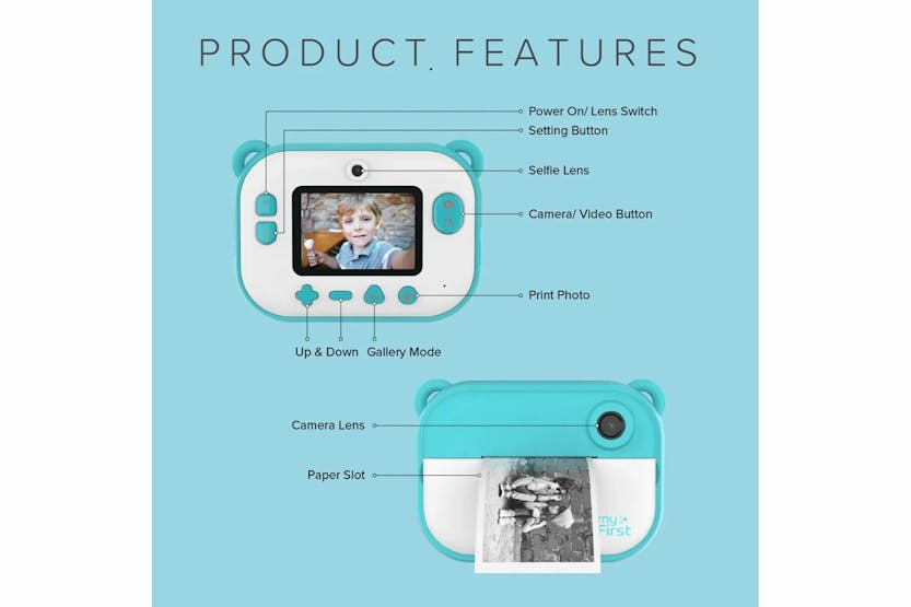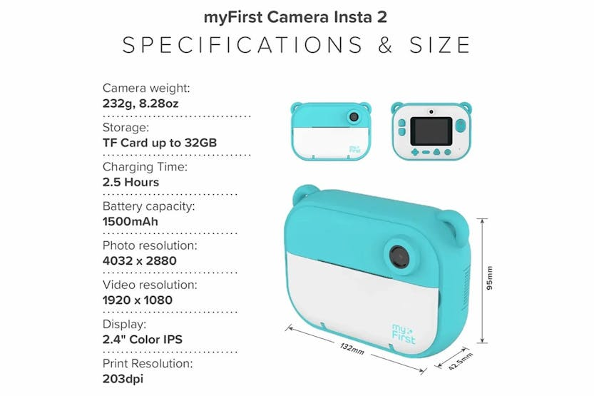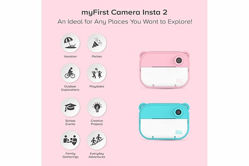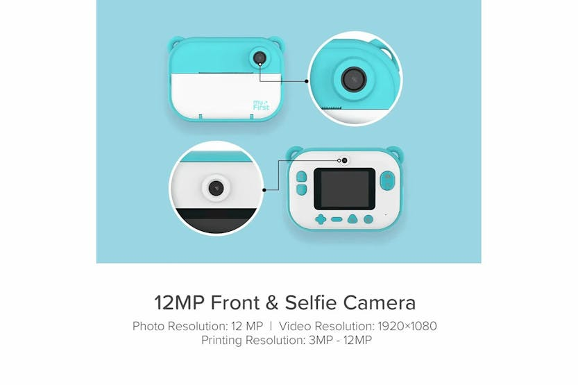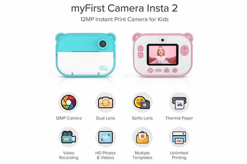 Capture precious moments with the myFirst Camera Insta 2 Instant Print Camera & Thermal Printer in Blue. This kid-friendly camera allows for instant printing in just 10 seconds, with sharp images and pre-loaded frames for added fun. The lightweight design, refillable thermal paper, and sticker rolls make it perfect for kids aged 4 to 13 to enjoy on vacations, family activities, arts and crafts projects, and more. With a 12MP front and selfie lens, dual lens capability, HD photo and video recording, and unlimited printing, the myFirst Camera Insta 2 offers endless entertainment for your child. The included thermal paper rolls, sticker paper, charging cable, and lanyard ensure your little one can easily capture and cherish memories all day long.