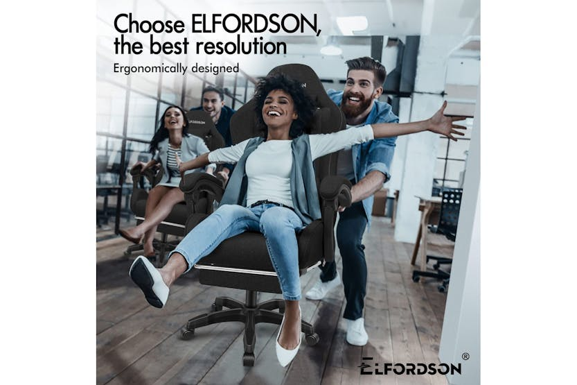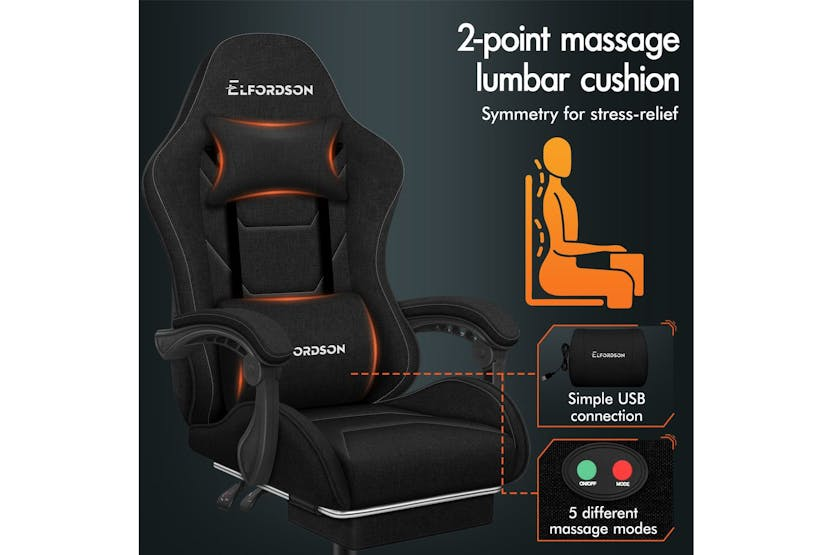 Experience the ultimate comfort and style with the Elfordson Gaming Chair in black. Designed for both gamers and executives, this chair features top-notch breathable Fabric Linen, car-seat grade foam padding, and a 2-point massage function with adjustable cushions for optimal support. With a 150-degree tilt and 360-degree swivel, this chair offers a perfect blend of flair and function for your gaming or working needs. Safety is ensured with SGS-approved gas-lift and TUV-approved caster wheels, making it a reliable and stylish addition to your space. Enhance your sitting experience with the Elfordson Gaming Chair, offering a luxurious combination of comfort and functionality. With its sleek black design, sturdy sporty nylon base, and ergonomic features like adjustable cushions and a 2-point massage function, this chair provides the perfect support for long hours of gaming or work. The 360-degree swivel and 150-degree tilt allow for easy movement and posture adjustment, while the SGS-approved gas-lift and TUV-approved caster wheels ensure safety and stability. Upgrade your seating experience with the Elfordson Gaming Chair and enjoy a new level of comfort and style in your space.