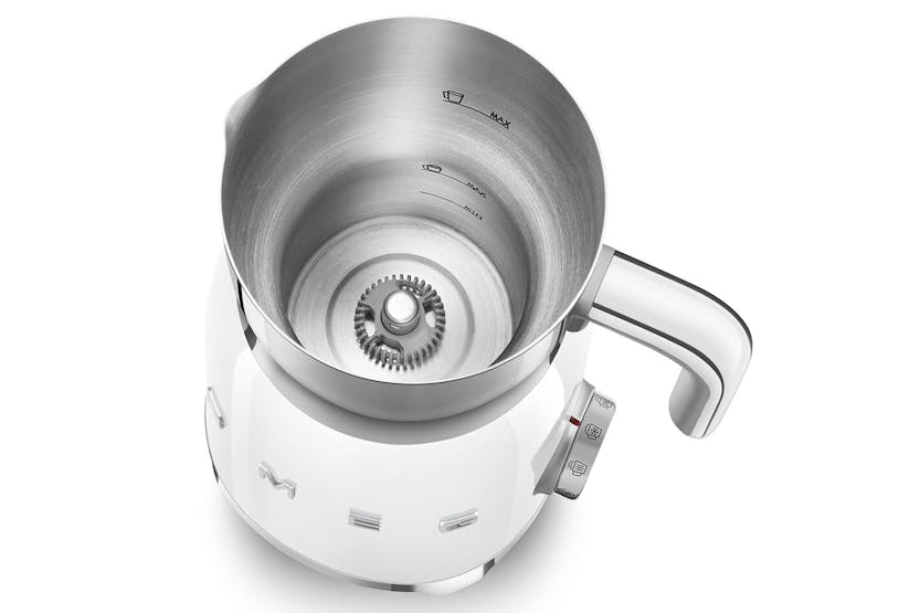 Experience the perfect cup of frothy goodness with the Smeg 50's Style Milk Frother in White. This stylish appliance offers 6 automatic programmes and a manual function, allowing you to create a variety of hot and cold drinks with or without foam to suit any preference. With its induction heating system and sleek 50's style design, the MFF11WHUK is both robust and easy to operate, making it a must-have for any coffee lover's kitchen. In addition to its versatility, this milk frother features a hot chocolate function and a hot milk function, as well as various froth density options. The removable carafe has a 600ml capacity, perfect for preparing multiple drinks at once, while the included accessories ensure effortless preparation of your favorite beverages. Add a touch of retro charm to your coffee routine with the Smeg 50's Style Milk Frother in White.