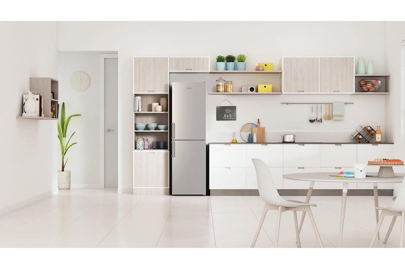Upgrade your kitchen with the Indesit 55cm Freestanding Fridge Freezer. This sleek silver appliance offers ample storage space with glass shelves and a convenient bottle balcony. The LED lighting ensures easy visibility of all your items, while the reversible door and compact 55cm width make it ideal for small spaces. The Open Space design in the freezer allows for easy storage of larger items. With Optimal Humidity technology to keep your food fresh, this fridge freezer is the perfect ally in the kitchen. Get 10% back in Harvey Norman Gift Cards when you spend 500 or more on Large Appliances. Choose the Indesit IB55732SUK Fridge Freezer for efficient cooling and convenient storage solutions.