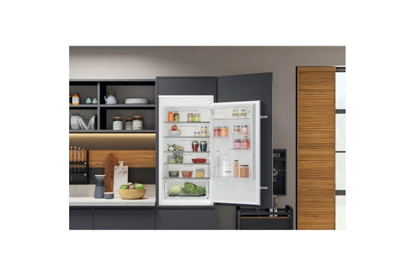 The Hotpoint Integrated Fridge Freezer HTC18T112UK offers Total No Frost technology to prevent moisture and ice build-up, ensuring your food stays fresh longer and eliminating the need for defrosting. With Active Fresh technology, the fridge maintains a precise temperature and quickly recovers after the door has been left open. The Fresh Zone+ drawer keeps fruit and vegetables fresh for up to 2 weeks, while the Temperature Alarm alerts you to any unexpected temperature changes. This energy-efficient fridge freezer also features glass shelves, a convenient bottle balcony, and a sleek white design, making it a practical and stylish addition to any kitchen.
