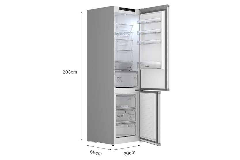 Keep your fresh foods at their peak with the Bosch Series 4 Freestanding Fridge Freezer | KGN392LDFG. Featuring VitaFresh XXL Pro 0°C technology, your fruits, vegetables, fish, and meat stay fresher for longer with optimal climate control. LED lighting, automatic super freezing, and two separate cooling circuits offer convenience, energy savings, and efficient cooling performance. With features like SuperCooling, NoFrost technology, and FreshSense sensors, this fridge-freezer ensures your food stays fresh, flavorful, and perfectly preserved without the hassle of defrosting. Experience maximum freshness and functionality with the Bosch Series 4 Freestanding Fridge Freezer | KGN392LDFG. This fridge-freezer offers ample storage space, LED interior lighting, NoFrost system, PerfectFit design, and VitaFresh drawers to keep your food fresh and organized. With separate cooling circuits, SuperCooling function, and MultiAirflow system, this appliance delivers consistent temperatures, efficient cooling, and optimal storage conditions for all your fresh foods. Upgrade your kitchen with this sleek and reliable fridge-freezer that enhances the longevity and quality of your groceries.