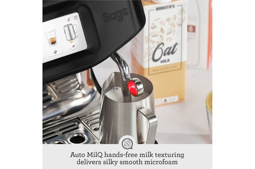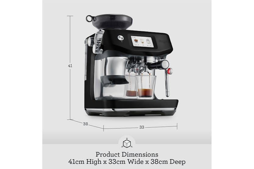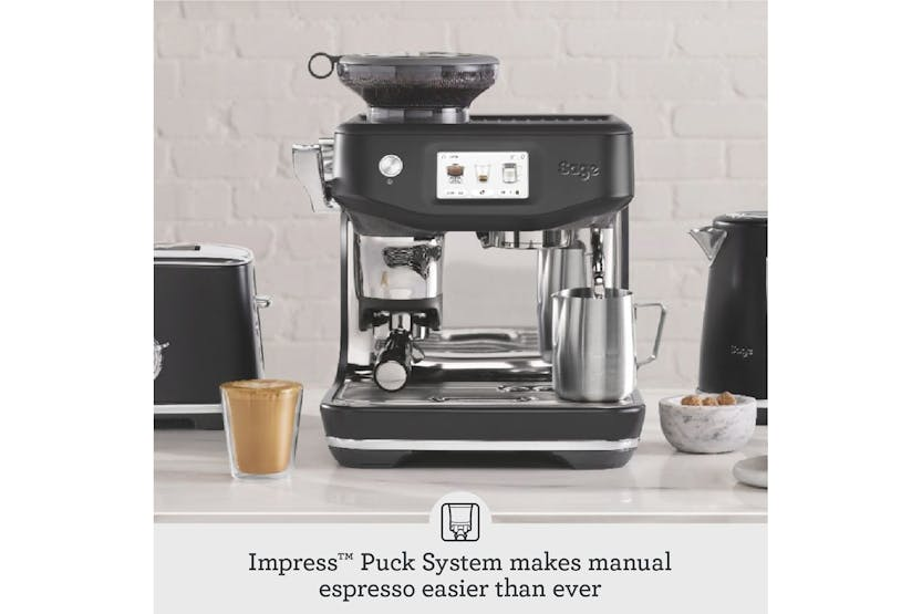 Experience the ultimate convenience and precision with the Sage Barista Touch Impress Bean to Cup Espresso Coffee Machine in Black Truffle. With pre-programmed cold cafe favourites, barista guidance, and an impressive touchscreen experience, this machine delivers cafe-quality beverages at your fingertips. The innovative ThermoJet heating system ensures optimal extraction temperature in seconds, while the Impress Puck System simplifies the dosing and tamping process for a perfect puck every time. Elevate your at-home coffee experience with the 4 Keys Formula and 14 cafe favourite presets, creating specialty drinks with ease. The Barista Touch Impress offers a seamless coffee-making experience with its advanced features such as alternative milk settings, 30 grind settings, and the ability to create, save, and name customisable drinks. With a capacity of 340g bean hopper and a range of construction materials including stainless steel, this machine combines power and precision to bring the third wave specialty coffee experience to your home.
