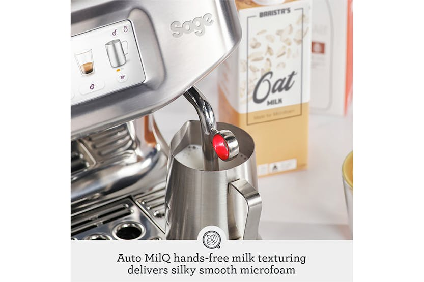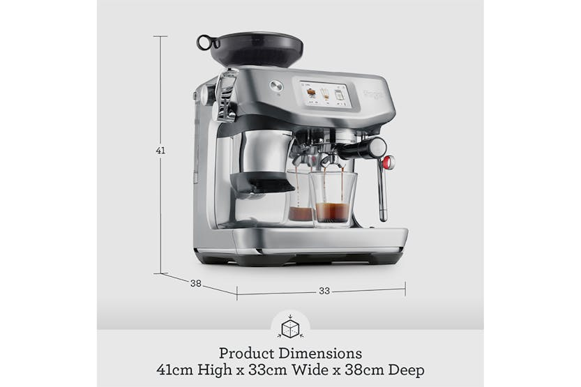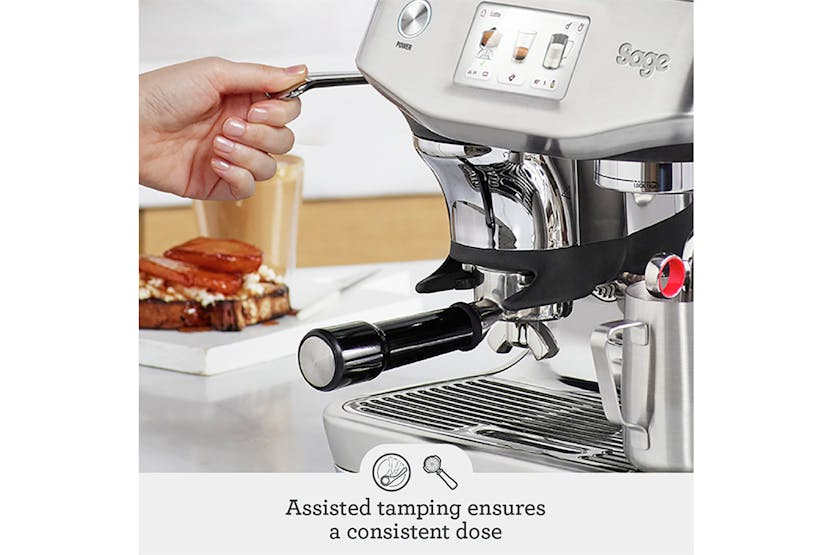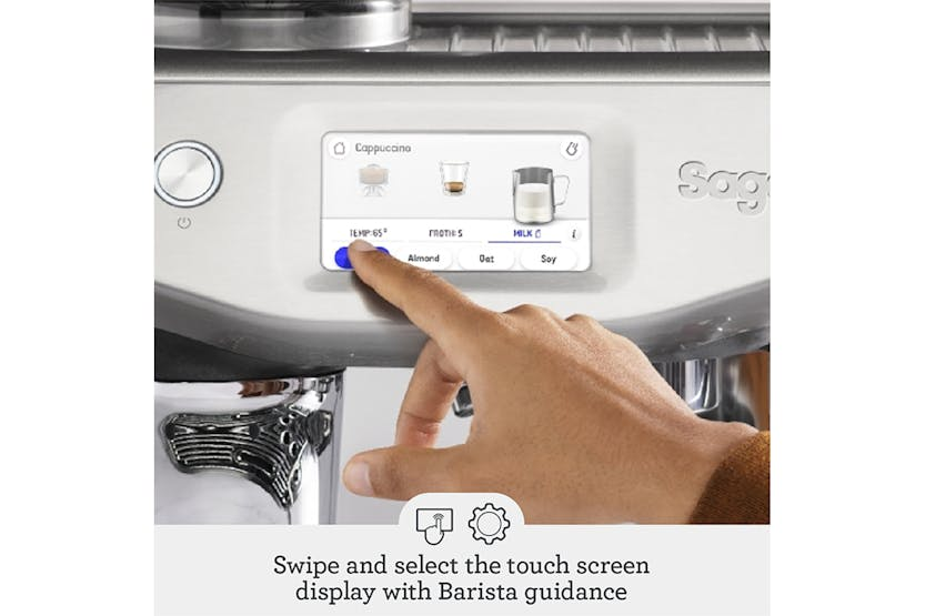 Experience the ultimate convenience and precision with the Sage The Barista Touch Impress Bean to Cup Espresso Coffee Machine. With pre-programmed cold cafe favourites like Cold Brew and Cold Espresso, plus alternative milk settings for dairy, soy, almond, and oat, you can enjoy a wide range of delicious coffee recipes at home. The impressive touchscreen guides you through the brewing process, while the ThermoJet heating system ensures optimum extraction temperature in just 3 seconds. Elevate your coffee game with the Impress Puck System, Baratza European Precision Burrs, and the 4 Keys Formula for third wave specialty coffee perfection. Say goodbye to the wait and hello to barista-quality coffee every time. The Sage The Barista Touch Impress Bean to Cup Espresso Coffee Machine delivers a seamless coffee-making experience with its intuitive touchscreen, ThermoJet heating system, and Impress Puck System. Whether you're a fan of Cold Brew, Cold Espresso, or classic espresso drinks like Flat White and Cappuccino, this machine offers 14 cafe favourite presets and the ability to customize up to 6 drinks. With auto/manual dosing, 30 grind settings, and alternative milk options, you can create the perfect cup of coffee tailored to your preferences. Elevate your home brewing game with this sleek brushed stainless steel machine that