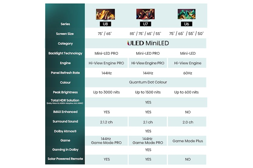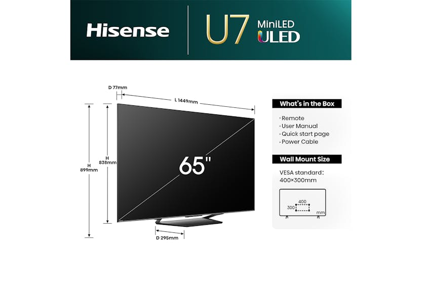 Elevate your gaming and viewing experience with the Hisense 65" U7 Mini LED Smart TV. Featuring 144Hz Game Mode PRO and Auto Low Latency Mode, enjoy smooth gameplay with no input lag or frame tearing. The Mini-LED PRO technology delivers brighter, clearer pictures with incredible detail, while Quantum Dot Colour and Hi-View Engine PRO with AI Picture enhance visuals for a truly immersive experience. With built-in subwoofer and VIDAA TV for easy access to streaming services, the U7 Series is the perfect choice for gamers, sports fans, and movie enthusiasts alike. Level up your entertainment with the Hisense 65U71NQ. Immerse yourself in stunning visuals and powerful sound with the Hisense 65" U7 Mini LED Smart TV. Experience true darkness and stellar brightness with Mini-LED PRO and Full Array Local Dimming, while the 144Hz Game Mode PRO ensures ultra-fluid motions for a seamless gaming experience. Enjoy vibrant, true-to-life colors with Quantum Dot Colour technology and Hi-View Engine PRO with AI Picture, bringing every scene to life in exquisite detail. With built-in subwoofer for deep bass and VIDAA TV for easy content access, the U7 Series offers a premium viewing experience for all your entertainment needs.