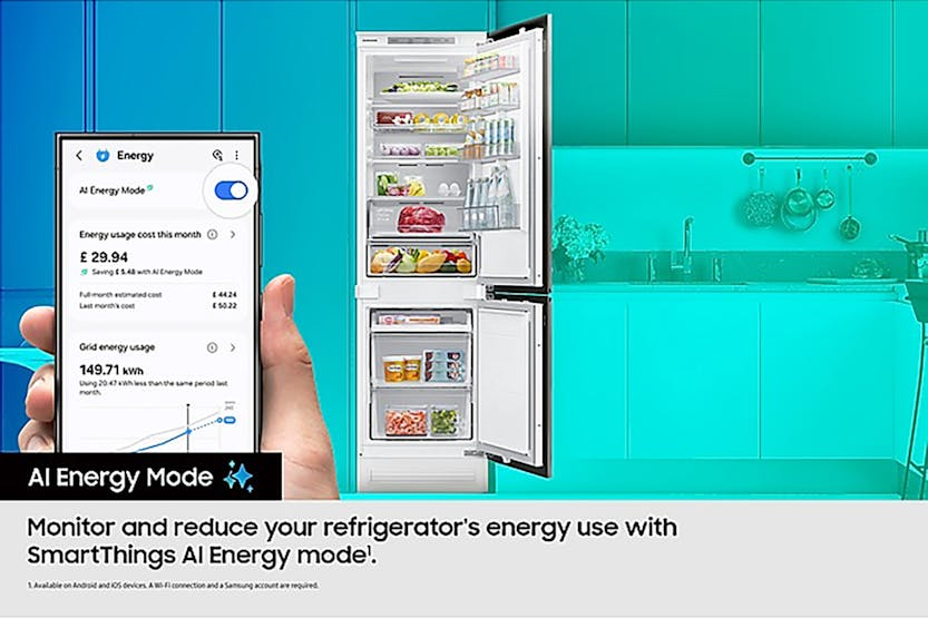 Upgrade your kitchen with the Samsung Integrated Fridge Freezer with All-Around Cooling. Enjoy extra fresh food and storage space, along with smart energy savings through AI Energy Mode. Keep your food evenly chilled with All-Around Cooling technology, and take advantage of SmartThings features for efficient energy management, problem-solving, and food organization. With convenient features like No Frost, Power Freeze, SpaceMax Technology, Gentle Lighting, and a versatile wine shelf, this fridge freezer offers top-notch performance and convenience for your home.