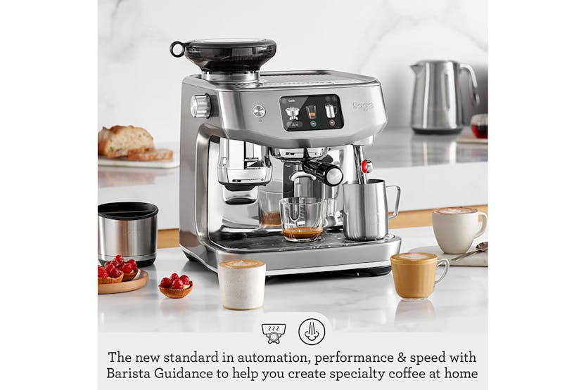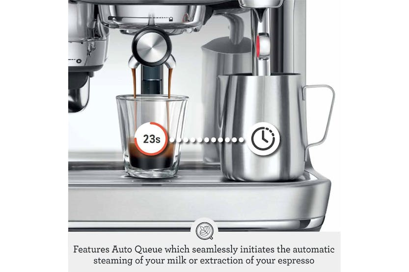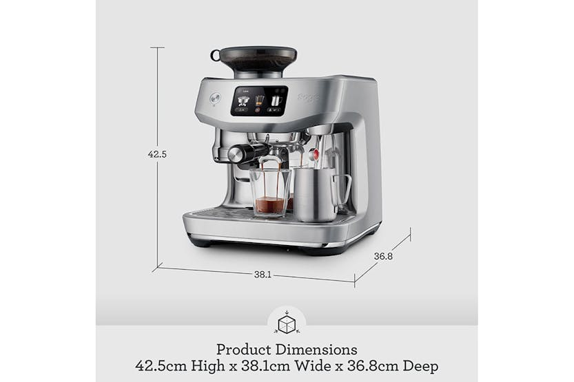 Elevate your coffee experience with the Sage Oracle Jet Coffee Machine. Crafted from stainless steel, this sleek and sophisticated machine offers the perfect balance of convenience and precision. With its intuitive touchscreen display, integrated conical burr grinder, dual boiler heating system, and automatic milk texturing, you can easily create your favorite coffee beverages at home with barista-quality results. Personalize your coffee profiles, adjust the temperature and milk texture, and enjoy the perfect cup every time. Upgrade to the Sage Oracle Jet for a truly exceptional coffee experience. Dimensions: 45.4 cm x 37.3 cm x 41.9 cm | Weight: 20 kg | Water Tank Capacity: 2.5 liters | Grinder Settings: 45 precision grind settings | Milk Frothing: Automatic with adjustable texture and temperature | Power: 2400W | Warranty: 2-year limited warranty.