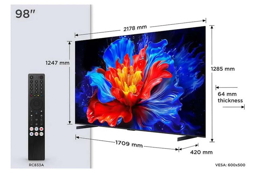Experience the ultimate in home entertainment with the TCL T8C 98'' QLED 4K HDR Smart TV. Featuring a Colorful Quantum Crystal display with over a billion hues, a 144Hz native refresh rate, and AiPQ Pro Processor for top-notch image quality, this TV delivers stunning visuals with vibrant colors and sharp details. The ONKYO 2.1 Hi-Fi system and vertical Ai sound field provide immersive audio, while features like Game Master mode and Hey Google voice control enhance your viewing experience. With a sleek ultra-slim design and advanced gaming capabilities, the TCL T8C is the perfect choice for a cinematic and interactive entertainment experience at home.