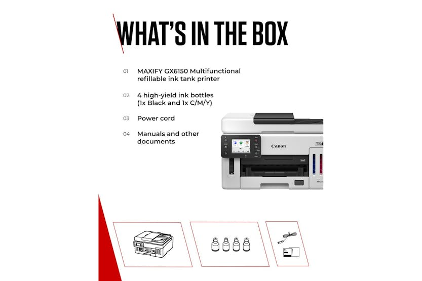 Description Online Only Introducing the CanonMAXIFY GX6150 Multifunction MegaTank Printer , a revolutionary product in the world of printing and cutting. Brought to you by the trusted brand CANON , this high-performance printer has been designed to deliver unmatched convenience and top-notch performance. Belonging to the elite category of Computers & Tablets , especially in the line of PRINTING & CUTTING , CANON has indeed set the mark high with this multifunction MegaTank printer. This awesome beast doesn't just fit into your PRINTERS & MULTIFUNCTIONS needs; it surpasses them with breathtaking functionality. Being driven by innovative technology, the CanonMAXIFY GX6150 will revolutionise your printing experience. Its ultra-fast, crisp, and high-quality prints will not just fulfil, but exceed your expectations. Contrastingly, the compact design of the printer allows for easy setup and usage, making it an ideal choice for both professional and personal use. With its revolutionary MegaTank technology, you can harness the power of high volume printing like never before. The compact design and silent operation make it the ideal solution for a convenient yet quiet work environment. Plus, with high-speed scanning, multiple connectivity options and user-friendly touchscreen operation, printing tasks have never been this simple. The remarkable CanonMAXIFY GX6150 Multifunction MegaTank printer offers unique features that set it head and shoulders above the rest: The CanonMAXIFY GX6150 holds the crown in the realm of top-class printers. Ideal for anyone seeking a reliable and efficient printing experience, it's absolutely one of the must-haves for every office and home. Join the many happy Irish consumers already experiencing the superior performance and convenience this printer has to offer and elevate your printing tasks to a whole new level. Order your CanonMAXIFY GX6150 today! Product Features An in-built MegaTank system for cost-effective, high-volume printing. High-speed scanning and printing capabilities. A sleek, modern design that fits seamlessly into any work or home office environment. Packed with advanced technology and user-friendly features. Easy to set up with a guided installation process. Compatible with various media sizes, adding to its flexibility.