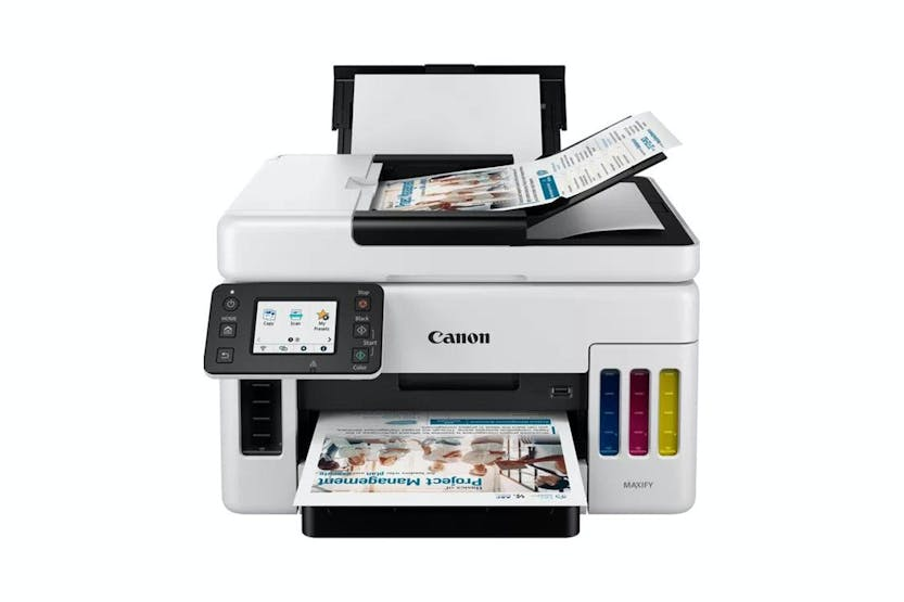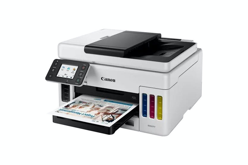 Description Online Only Maxify GX 6050 Experience highly productive business printing with mega tank using high yield, refillable ink tanks. Count on business quality prints and an extremely low total cost of ownership. Small Decisions, Maximum Impact Produce business-quality documents quickly with average savings of 85% on the total cost of ownership vs top 10 laser and inkjet printers4 with these ever-dependable, high volume refillable mega tank printers. Check out the video: MAXIFY GX â“ Product Video A refillable ink tank printer that packs a heavyweight performance Excellence in Every Environment Where low-cost per page and high volume daily printing matter, the MAXIFY GX6050 really excels. Estate Agencies Produce property portfolios quickly for clients, scan and copy key documents easily with the 50-Sheet ADF without worrying about ink or paper running out. Print business cards on matte or glossy media. Retail Print invoices effortlessly thanks to consistent reliability, high speed and a compact footprint. Create high quality, durable point of sale material, promotional banners and tags all in-house. Private Clinics Print client records, new appointment details and even print directly on envelopes. Create persuasive collateral to promote your clinic's capabilities. Educational Institutions Create course materials, presentation handouts as well as administrative documents easily every day with a cost-conscious printer. Low Costs That Stay Low Keep business printing costs down with huge yields of 14,0001 pages from a set of colour ink bottles or 6,0001 pages from a black ink bottle. Switch to Economy mode for even greater savings.2 Durable Documents On The Double Print stand-out business documents with pin-sharp detail at deadline-beating speeds of 24 ipm in black and 15.5 ipm in colour.3 Manage document workflow easily using dedicated business functions. Compact Yet Highly Capable Make light work of busy schedules with a 50-sheet auto document feeder, tiltable 6.9cm colour touch screen and paper supply of up to 350 sheets. Handle diverse media even print banners up to 1.2m in length. Maximise Efficiency Be responsible with energy efficient inkjet printing with high yield ink bottles that help reduce waste. A user-replaceable maintenance cartridge keeps downtime to a minimum. Get Connected Print, scan, copy, and connect to the cloud via the Canon PRINT app. Compatible with Apple AirPrint (iOS) and Mopria (Android) and harness Ethernet connectivity plus dual-band Wi-Fi support. Canon Print App Enjoy smooth connectivity from palm to printer with the Canon PRINT app. Effortlessly print, copy and scan from your smart devices, check your printer's status and link up to the cloud for more flexible control. Printer Features: Print Resolution: Up to 600 x 1200 dpi[1] Print Margins (min.): Top: 3mm, Bottom: 5mm, Left & Right: 3.4mm Print Technology: 1 print head refillable ink tank printer First-Print-Out Time: Mono: 7 sec (ready/simplex)[4] colour: 8 sec (ready/simplex)[5] Two Sided Printing: Auto duplex print (A4, Letter - Plain Paper) Consumables and Yields: Standard Ink Bottles: GI-56 BK, GI-56 C, GI-56 M, GI-56 Y Maintenance Cartridge: MC-G01 (User Replaceable) Bottle Yield (Plain Paper): A4 colour documents printing[6], Black: 6,000 pages (Economy mode 9,000 pages)[7], colour: 14,000 pages (Economy mode 21,000 pages)[8] Estimated supplemental yield Paper Support: Paper Types: Plain Paper, Red Label Superior 80 g/m2 (WOP111), Canon Oce Office Colour Paper 80 g/m2 (SAT213), Photo Paper Plus Glossy II (PP-201), Photo Paper Pro Luster (LU-101), Matte Photo Paper (MP-101), Glossy Photo Paper "Everyday Use" (GP-501), High Resolution Paper (HR-101N), Envelope, Photo Paper Plus Semi-gloss (SG-201), Restickable Photo Paper (RP-101), Magnetic Photo Paper (MG-101), Light Fabric Iron on Transfers (LF-101), Double sided Matte Paper (MP-101D) Maximum Paper Input: Rear Tray: Max. 100 sheets (plain paper), Cassette: Max. 250 sheets (plain paper), ADF: A4, A5, LTR: 50 Sheets, LGL: 10 Sheets Paper Sizes: Rear Tray: A4, A5, A6, B5, LTR, LGL, 4"x6" (10 x 15 cm), 5"x7" (13 x 18 cm), 7"x10" (18 x 25 cm), 8"x10" (20 x 25 cm), Square 5"x 5", (127mm x 127mm), Envelopes (DL, COM10), Custom size (width: 89 mm - 216 mm, length: 127 mm - 1,200 mm), Cassette: A4, LTR, A5, B5, ADF: A4, A5, LTR, LGL Paper Weight: Rear Tray: Plain Paper: 64 g/m2 - 105 g/m2 or supported genuine Canon papers, Canon paper: Max. paper weight Approx. 275 g/m2(Photo Paper Plus Glossy II (PP-201), Cassette: Plain Paper: 64 g/m2 - 105 g/m2 Scanner Features: Scanner Type: Flatbed (ADF / Platen) CIS colour scanner Scan Speed: Simplex. 16.9 ipm Colour[9], Simplex. 22 2 ipm Black[10] Line Scanning Speed: Colour: 1.4 ms/line (300 dpi), Greyscale: 1.4 ms/line (300 dpi)[12] Scanning Depth (Input / Output): Colour: RGB each 16bit / 8bit, Greyscale: 16 bit / 8 bit Maximum Document Size: Platen: A4/Letter (216 x 297 mm), ADF: A4/Letter/Legal (216 x 356 mm) Copier Features: Copy Speed: sFCOT (colour): Approx. 12 sec[13], sESAT (colour): Approx. 12.7 ipm[14], ESAT/Simplex ADF (colour): Approx. 12.2 ipm[15], ESAT/Simplex ADF (black): Approx. 22.2 ipm[16] Copy Quality: 3 levels (Economy, Standard, High) Intensity Adjustment: 9 levels (automatic adjustment available, AE copy) Multiple Copy: 99 copies (max.) Copy Functions: Document Copying, Two-Sided Copy, Manual Two-Sided Copy with ADF, 2-on-1 and 4-on-1 copy, Collated Copy (ADF only), Frame erase copy (Flatbed only), ID copy Copy Zoom: 25 - 400% Fit to page, A5 to A4, B5 to A4, A4 to A5 and A4 to B5 Interface: Display Type & Size: 2.7" / 6.9cm LCD (Touch Screen, Color) Display Languages: 33 Languages Selectable: Japanese, English (mm & inch), German, French, Italian, Spanish, Portuguese, Dutch, Danish, Norwegian, Swedish, Finnish, Russian, Ukrainian, Polish, Czech, Slovenian, Hungarian, Slovakian, Croatian, Romanian, Bulgarian, Turkey, Greek, Estonian, Latvian, Lithuanian, Simplified Chinese, Korean, Tr