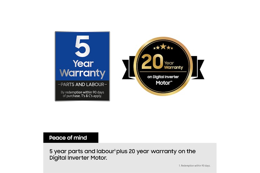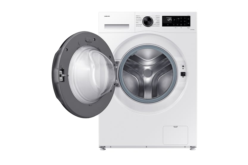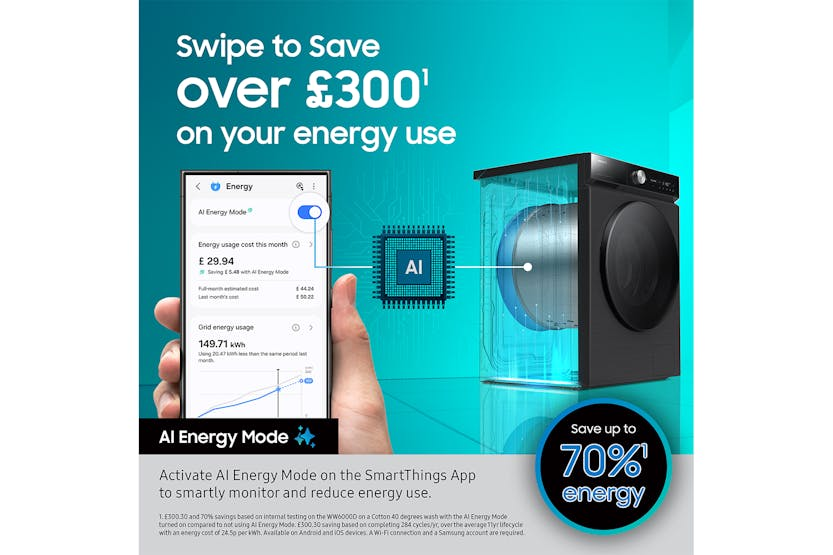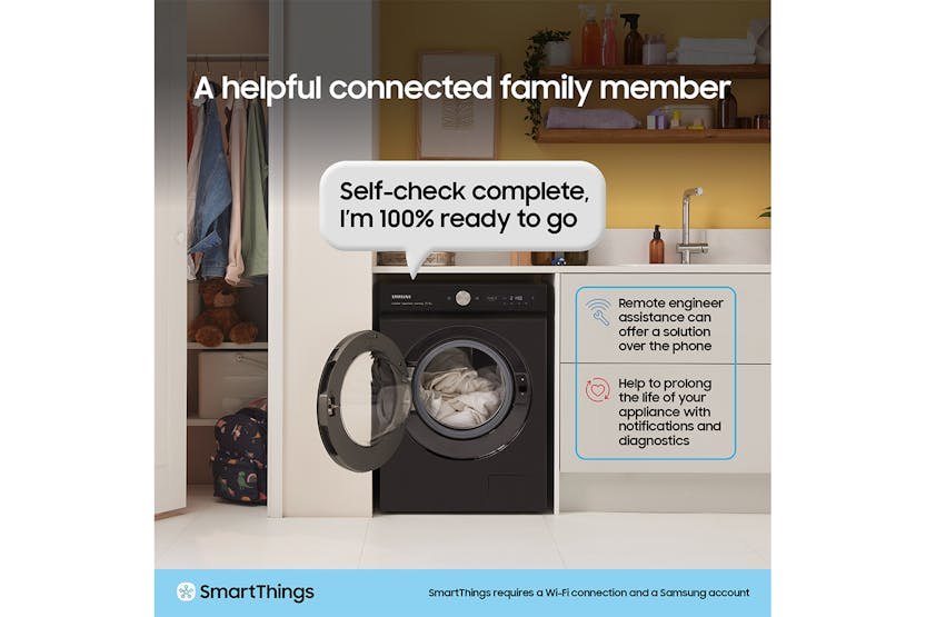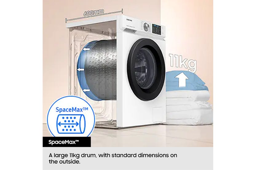 Description Wash Intelligently Smart Energy Savings: Smartthings AI Energy Mode Monitor and reduce the washer's energy use. AI Energy mode lets you check the power consumption and estimates your electricity bill. For courses that operate in AI Energy mode it reduces energy use by up to 70% using Ecobubble to wash with cool water instead of warm and extra cycle time. Check out the video: *Available on Android and iOS devices. A Wi-Fi connection and a Samsung account are required.** Can be applied when the selected washing temperature is 20~40°C.*** Based on internal testing on the WW11BB944AGB model in normal usage conditions.Results: Power consumption without AI Energy Mode = 0.539 KWh. Power consumption with AI Energy Mode = 0.145 KWh. Results may vary depending on the actual usage conditions. Wash for Less: A-10% Extra Energy Efficiency Wash clothes using less energy. The Samsung washing machine is highly energy efficient and even exceeds the minimum energy efficiency requirements for the Class A rating by up to 10%*. Advanced technologies enhance the washing performance and reduce the wash time, which reduces its energy use. *Based on Samsung internal testing. The WW5000D series models are 10% more efficient than required to achieve the Class A energy efficiency rating under Regulation (EU) No 2019/2014. Results may vary depending on the usage environment. Smart, Gentle Washing: AI Ecobubble Enjoy effective washing with AI Ecobubble*. It creates bubbles that remove 24% more soil** even in cool water. It also detects the fabric type and adjusts the amount of bubbles, washing time, temperature and spin speed. So it saves up to 70% energy*** compared to washing in warm water and ensures 45.5% better fabric care****. Check out the video: *AI Ecobubble is only activated when specific courses are selected, including Cotton, Synthetics and AI Wash with loads less than 2kg.** Based on the Performance Lab Test report by Springboard Engineering on EMPA strips, comparing a normal detergent solution and bubble technology without mechanical action. Individual results may vary.*** Compared to washing in warm water. Tested in accordance with IEC 60456-2010 / 4kg Wash Load / Super Eco Wash cold (WF80F5E5U4W) vs. Cotton 40°C without Ecobubble (WF0702WKU). Individual results may vary.**** Based on an EMPA test on a 9kg model (WF906U4SAGD, Synthetics), with and without Ecobubble. Data collected from individual tests. Actual results may vary depending on individual use. Performance Wash in 39 Minutes: Super Speed Cut your daily laundry time and get clothes thoroughly clean. Use Super Speed to wash a load in just 39 minutes*. QuickDrive saves time by moving clothes dynamically, while Ecobubble ensures powerful cleaning. The rinsing time is shortened using Speed Spray and it accelerates the spin speed. *Based on using Super Speed at the default settings with a 5kg load. Reduces Microplastic: Less Microfiber Cycle The Less Microfiber cycle works to make clothes shed less microplastics, which are discharged into the drain water. By adjusting the motor's revolution speed and washing intensiveness, the Less Microfiber cycle reduces the amount of microfiber released into the drain water by up to 54%*. *Based on testing by the Ocean Wise Plastics Lab using a 2kg load of 100% polyester hoodies, comparing the Synthetics cycle on a Samsung conventional model WW4000T and the Less Microfiber cycle on the WW7000B. Results may vary depending on the actual clothes and usage conditions. More Space Inside: SpaceMax Wash large loads with a huge 11 kg capacity interior in a 600mm depth cabinet*. SpaceMax technology creates more space inside to incorporate a larger drum without increasing the external dimensions. So your washer will fit in easily and you can wash many clothes at once, including big items. *Only available in the 11kg capacity model. Intensive Cleaning: Bubble Soak Get your clothes spotlessly clean, even if they are really dirty. The Bubble Soak function helps remove a wide variety of stubborn stains, like blood, tea, wine, make-up and grass. Clothes are thoroughly soaked in active bubbles, so dirt and stains are loosened and can be removed effectively. *Tested in accordance with IEC 60456 5th edition / 8kg Wash Load / Bubble Soak Wash vs. Cotton 40/60°C, Synthetic 60°C, and Denim 40°C without Bubble Soak. Do the SmartThings at Home Connect your Life with SmartThings: Wi-Fi Embedded Use your washer easily and effectively with the SmartThings App*, which enhances your washing. The Laundry Recipe recommends the appropriate wash cycle** for each load. The Laundry Planner enhances your daily schedule***, And Auto Cycle Link**** selects an optimal drying course after a wash. *Available on Android and iOS devices. A Wi-Fi connection and a Samsung account are required. It stores user data, preferences and usage patterns to suggest the most useful options.** The user will be solely responsible for any consequence(s) that may result, including but not limited to any damage or harm caused by incorrect information provided by the user.*** The recommended washing cycle is only based on time and may not be appropriate for the type of fabrics or stain level of the articles being washed **** A Wi-Fi connection is required at all times, which may increase energy consumption. SmatThings Energy: Efficient Energy Use. Smart Savings Manage your household's energy use anytime. SmartThings Energy* provides helpful energy efficiency tips. It also lets you monitor the energy consumption of smart appliances** in real time and compare it to the previous month. And it alerts you if your monthly targets are likely to be exceeded. *Available on Android and iOS devices. A Wi-Fi connection and a Samsung account are required.** SmartThings Energy currently works with around 40 Samsung home appliances that are SmartThings enabled. These include washing machines, clothes dryers, dish washers, air conditioners, air purifiers, vacuum cleane