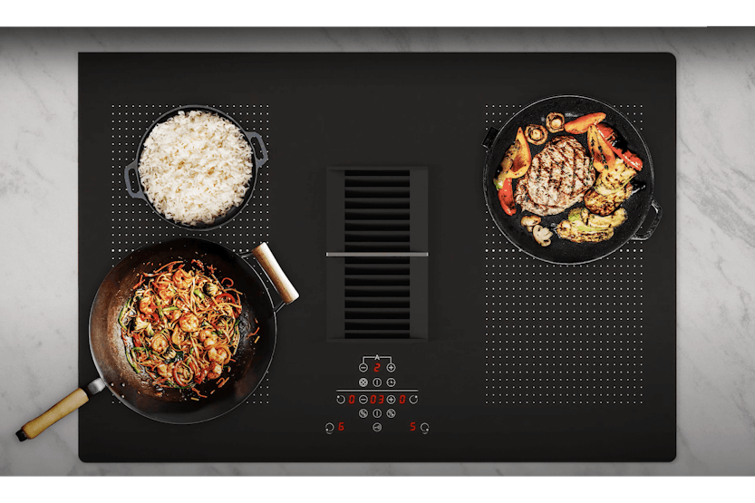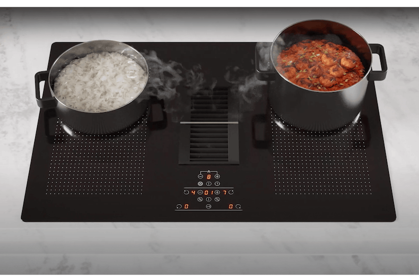 Description 77cm Powerflex induction hob with downdraft extraction Black glass with black grille 4 flexible cooking zones 9 power levels Timer LED touch sense display Pause/keep warm functions Residual heat indicator Touch control operation Auto pan detection system 6 fan speeds 579 m 3 /hr extraction Suited to vent/recirculate Fan motor pack included Optional filter kit - ICONKIT1 32amp connection cable supplied Dimensions: W: 770MM x D: 520mm