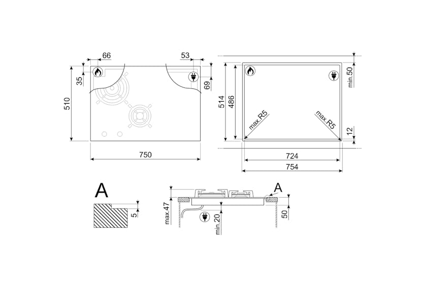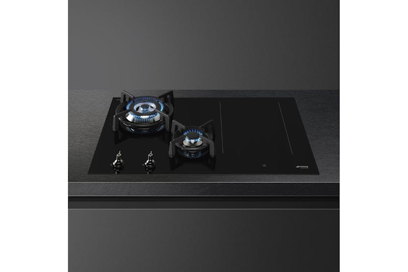 Description Mixed Fuel Hobs For those who enjoy cooking and appreciate both gas and induction cooking, you can now have the best of both worlds. In a single hob, the mixed fuel hob combines an induction zone with traditional gas burners, offering maximum versatility of use. 90cm and 75cm widths come with an ultra-rapid gas burner and durable cast iron pan stands, accompanied by induction zones. The induction zones can be used separately or together as a single large space. Multizone Operation Smeg's MultiZone heating zone can be used as two independent cooking zones or combined into a single zone. Each zone automatically adapts to the size and position of the dishes and is heated only where the pans locate, providing better heat distribution. Fast Operation Induction allows for precise temperature control when doing intricate cooking, or simmering for example. Heat is only generated when the pan comes into direct contact of the specific cooking zone, ensuring safety in the presence of children. This helps optimise power consumption, only using the energy needed to heat the pan itself. Ceramic Glass Ceramic glass is able to withstand heat above 800˚C so it is extremely robust and durable. Composed of a single glass plate measuring only 4 to 8mm, this type of glass is resistant to impact and wear. Type: Type: Mixed Built-in: Ultra-low profile Power supply: Mixed Aesthetics: Aesthetics: Classic Material: Glass Glass type: Eclipse ceramic Controls colour: Steel effect Type of control setting: Control knobs Control knobs position: Front No. of controls: 2 Glass edge: Straight edge Slider Glass on Steel Pan stands: Cast iron Burners: Smeg contemporary Burners material: Brass Serigraphy colour: Grey Program/Function: Total no. of cook zones: 4 No. of gas cook zones: 2 No. of induction cook zones: 2 Time-setting options: Automatic switch-off No. of cooking zones with booster: 2 No. of flexible zones: 1 Main on/off switch Power levels: 9 Options: Standard cut out: 482-486x719-724 mm Multizone option Flexible zone type: Multizone End cooking timer: 2 Pause option Minute minder: 1 End of cooking acoustic alarm Residual time indicator Limited power consumption mode: Advance Limited power consumption mode in W: 2100 a 3700 - step 100 W Show room demo option Grill function Control lock / child safety Keep warm automatic function Bridge option Quick startrapid level selection Cooking Zone: 1st zone position: Front left 2nd zone position: Rear left 3rd zone position: Rear right 4th zone position: Front right 1st zone type: Gas - AUX 2nd zone type: Gas - UR 3rd zone type: Induction - Multizone 4th zone tipe: Induction - multizone 3rd zone dimensions: 24.0x18.0 cm 4th zone dimensions: 24.0x18.0 cm Right Multizone dimension: 38.5x23.0 cm 1st zone power: 1.10 kW 2nd zone power: 3.30 kW 3rd zone power: 2.10 kW 4th zone power: 2.10 kW Power double booster 3° zone: 3.00 kW Power double booster 4° zone: 3.00 kW 3rd zone booster power: 2.50 kW 4th zone booster power: 2.50 kW Booster power right Multizone: 3.60 kW Performance / Energy Label: Energy consumption zone 3: 191 wh/kg Energy consumption zone 4: 195 wh/kg Electrical Connection: Gas connection rating (w): 4300 w Nominal power (w): 3700 w Voltage (v): 220-240 v Voltage 2 (v): 380-415 v Type of electric cable: Single phase Power supply cable length: 120 cm Accessories Included: Cast iron wok support: 1 Other gas nozzles included: G30 GPL liquid gas Other gas connections provided: Conical Product Features: Gas type: G20/G25 natural gas Automatic setting according to pan dimension Permanent automatic pot detection with indication of the relative control Automatic pan detection Gas safety valves Automatic ignition Automatic switch off when overheat Automatic switch off when overflow Protection against accidental start up