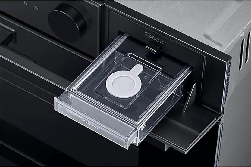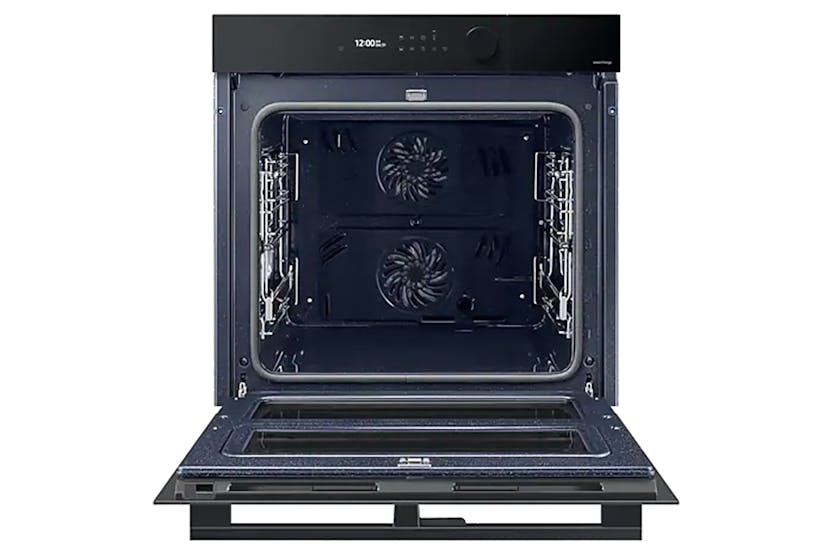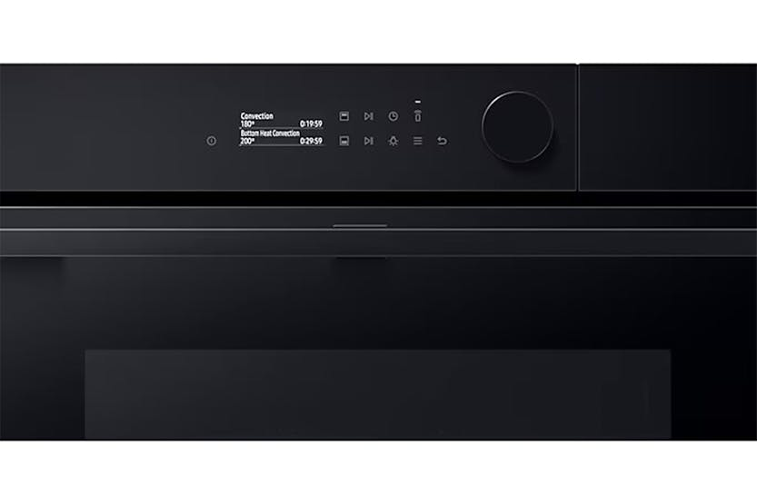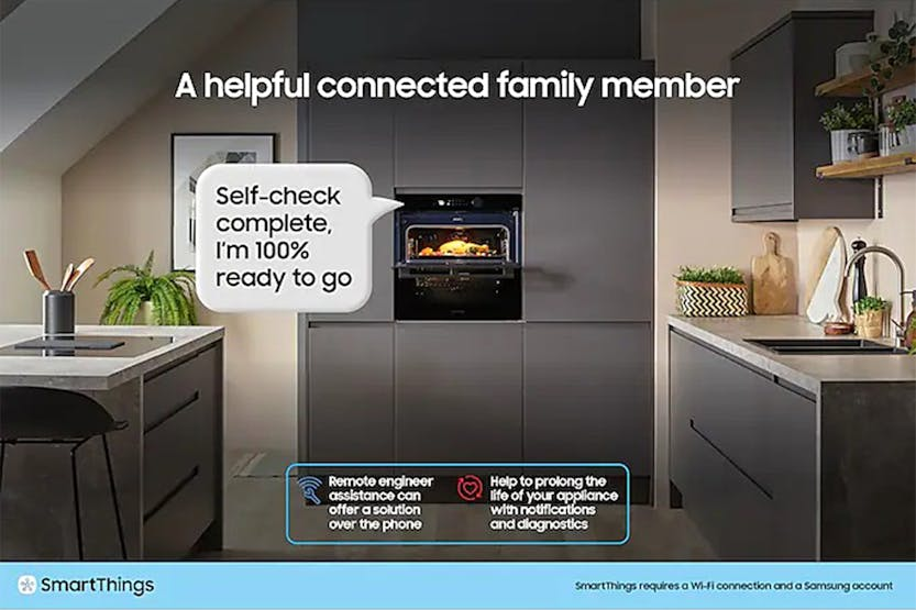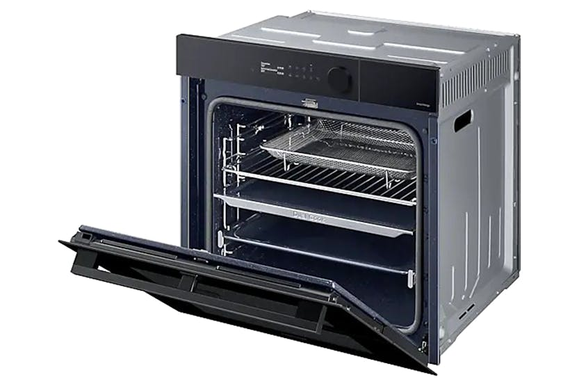 Description Cook More Intuitively Dual cook steam Dual cook flex Modernized design 2 Small or 1 Big Oven: Dual Cook Flex Cook different meals more flexibly and efficiently. Dual Cook Flex's upper and lower zones work independently. Use just the top for smaller dishes, both together with different temperature and time settings or the whole oven for large dishes. And a hinged door lets you access the top easily. *NV7B5675LAK model tested. Total energy consumption is reduced by 25.3%" and the cooking time is reduced by 22.7%", according to internal test results based on the IEC- 60350 test protocol (small cakes, convection 165℃, compared to whole compartment). Actual savings will vary depending on the cooking item, usage and other factors. One door. Two ways: Flexible Door Enjoy complete flexibility to cook various dishes with a hinged Flexible Door. Just open the top half to use the upper zone for small meals. It makes it easier to check on dishes and season food, with less heat loss. Or open the whole door to use both zones when cooking many different foods. Healthier Fried Food: Air Fry Enjoy healthier fried food without a deep fryer. Air Fry combines a special tray with hot air circulation that envelops food. It is the ideal way to cook chips or even vegetables as it eliminates excess fat, but everything is still crispy and brown outside and juicy inside. Cook & Steam Together: Dual Cook Steam Enjoy oven cooking and steaming at the same time, or add steam to keep food moist. Dual Cook Steam lets you prepare healthy steamed dishes, while simultaneously oven cooking various foods with different settings. Or use Add Steam when roasting or baking to ensure food is both crisp and tender. * Only available on certain models. Crisp & tender food: Add Steam* Get deliciously succulent and crispy food. Add Steam* fills the oven with steam to ensure that your food retains more of its natural moisture. So it is always tender and soft inside, but still deliciously crisp outside. And you can easily adjust the amount of steam across 3 levels. Simply More Intuitive: Modernised Design Enjoy a hassle-free cooking experience with intuitive and personalised control. The modernised design has a stylish control panel with a 2.25"" LCD display and a single knob. Based on your usage patterns, it shows the most frequently used options, which can be quickly selected. Always Keeps the Oven Neat with Heat: Pyrolytic Cleaning* Keep the inside of your oven neat and clean without wasting time and effort scrubbing or using costly cleaning products. A Pyrolytic Cleaning* system heats the cavity to burn off any grease and residue left from cooking. Everywhere is left spotless with only a few ashes to wipe away. * Only available on certain models. More Joy, Less Burden: SmartThings Cooking Make your kitchen experience more joyful. SmartThings Cooking* saves time and minimises the burden of cooking. By understanding your needs, it recommends personalised recipes** and creates a weekly meal plan. It also offers a guided cooking experience and enables effortless food shopping***. * Requires a wireless network and the Samsung SmartThings App. The Samsung SmartThings App supports Android OS 4.0 (ICS) or later, which is optimised for Samsung smartphones (Galaxy S and Galaxy Note series). This App also supports iOS 7 or later for iPhone models. The SmartThings App is available in the App Store and Play Store. ** Available in certain languages, including English, French, German, Italian and Spanish. *** Only available in the UK and Germany. Other countries will be added soon. Totally Even Cooking: Air Sous Vide* Cook food more evenly without it overcooking or drying out. An Air Sous Vide* system accurately senses the temperatures in each cavity and maintains an even temperature for a long period. So everything is cooked thoroughly, wherever it is in the oven, and tastes deliciously tender and juicy. * Requires a dedicated sous vide cooking bag, which is not included with the oven. Cook Much More: Big Capacity (76L) Create more and larger dishes with a massive 76 litre capacity oven. It opens up more possibilities in home cooking. You can prepare lots of different food together, like everything you need for a party. Or it can easily accommodate large items, like a king-size turkey, for a family gathering. Remarkably Efficient: A+ Rated Energy Efficiency Make your home energy efficient. You can use the whole oven and enjoy exceptional A+ rated energy efficiency. All with the convenience of a large and flexible oven space. Smooth Gliding Shelf: Telescopic Rail* Get things in and out of the oven much more easily. The Telescopic Rail slides in and out smoothly with hardly any effort, even if you’re using large or heavy pans. It creates much less friction, so it’s much easier to load and unload. And you can baste, turn and season food without any spills. *Specifications may vary by model. Closes Smoothly, Gently and Silently: Soft Close Door* Enjoy a more peaceful cooking experience with the Soft Close Door. It closes safely, gently and silently. The hinge makes the door move smoothly in the final few centimeters, so it slowly and quietly shuts, with no vibration or banging sounds. *Specifications may vary by model. How to Measure What's in the Box: 2 x Square Baking Tray 1 x Square Wire Rack Telescopic Rail: 1 Level (Half) Air Fry Tray Product Features: Wi-Fi connection Dual cook steam Modernized design Convection: 1200 / 1200 W Read More