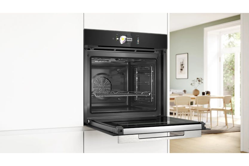 Description When Intuitive Meets Digital With our Digital Control Ring, operating your oven is not only easier but is also more innovative. Instead of rotary knobs, you intuitively adjust your oven settings directly on the control panel using just your index finger. Simply move your finger across the ring engraved on the control panel and confirm the desired setting with your fingertip. Puts Your Food on Display The innovative Digital Control Ring makes cooking easier than ever. With a slight turn of the engraved centre ring, you can adjust any of your oven’s settings with just one finger. You’re supported by the 6.8-inch, full-surface, high-resolution, plain-text TFT touchscreen and directly selectable buttons. Clear, vivid images and info texts assist you through each step as you navigate the programme options. Thus, you always have a complete overview and full control over your appliance’s functions. Bake Evenly on Any Level Baking just got a whole lot more flexible: with 4D Hotair, heat is distributed swiftly and evenly throughout your oven’s interior. Place your tray or rack on any level from one to four and enjoy consistently perfect results. And that’s not all: You can also bake biscuits or cookies on up to four levels at the same time, and get reliable results from top to bottom. The Gentle Way of Cooking Do you want to save energy while cooking? With Hotair Gentle, we’ve improved the heating mode that’s most commonly used in households. The fan distributes the heat evenly throughout the oven cavity, which can help save energy. When baking on a single level – such as small baked goods, cakes in tins or cakes on a baking tray – no preheating is necessary. Crispy and Tasty Do you want to give your roast a final crispy finish? Nothing could be easier thanks to the Crisp Function, which removes moisture directly from the oven cavity during the roasting or baking process. This gives your finished dish the extra crispiness you want. The Shortcut to Your Preferred Dish Are you sometimes unsure of which programme is right for which dish? Just ask the Oven Assistant. Connect your oven to your registered Home Connect account and simply tell it what dish you want to prepare via the Home Connect app or your Amazon Alexa voice control device. The oven will then suggest suitable settings or programmes and switch directly to your selection – an extremely convenient feature. To enjoy the Oven Assistant, just connect your oven to your registered Home Connect account. Love at First Bite Be it roast turkey, Easter lamb, Christmas carp – PerfectRoast meatprobe comes with the know-how of a professional chef, but at much less expense. Three highly sensitive measuring points help the sensor determine the core temperature within the food – accurate to degree and second. Maximum measurement accuracy is achieved by inserting all three measuring points at liberty, guaranteeing perfect roasting results. Another advantage: PerfectRoast may be used in combination with microwave and added steam functions - in case your oven offers these functions, too. Switch-Off Made Easy Are you uncertain whether your soufflé, pizza or roast is really done? Just connect your oven via the Assist function or the Home Connect app and let your Bosch oven make the decision for you. It knows when the dish has reached the right level of doneness and switches itself off accordingly. Naturally, it also informs you via a signal or the Home Connect app. To enjoy “Automatic Switch-off”, just connect your oven to your registered Home Connect account. Favourites on Demand To avoid having to enter the same settings for your favourite dish over and over again, just save them under “Favourites” so that you can access them instantly and at any time, both on the appliance and in the Home Connect app. To enjoy "Favourites", just connect your oven to your registered Home Connect account. The Connected Way of Cooking Do you want to discover the full potential of your oven? Just connect your oven to your registered Home Connect account so that you can control your appliance from wherever you are and can also use digital services. You can even use voice control with Amazon Alexa or Google Assist. Start and stop cooking functions, change settings and manage favourites – all while away from your kitchen. Settings are synced between the app and the oven. You’ll be informed via push notifications as soon as the programme is done. Software downloads keep your oven up to date. Enjoy cooking on your own terms. What's in the Box 1 x enamel baking tray 1 x combination grid 1 x universal pan Product Features: Digital Control Ring: The simple and innovative way to select oven settings. TFT Touch Display Pro: Perfect control thanks to an innovative Digital Control Ring and full-surface TFT touchscreen. 4D Hotair: Even heat distribution for perfect results – on any level. Hotair Gentle: Saves energy while baking and roasting. Crisp Function: For an even crispier finish. Read More