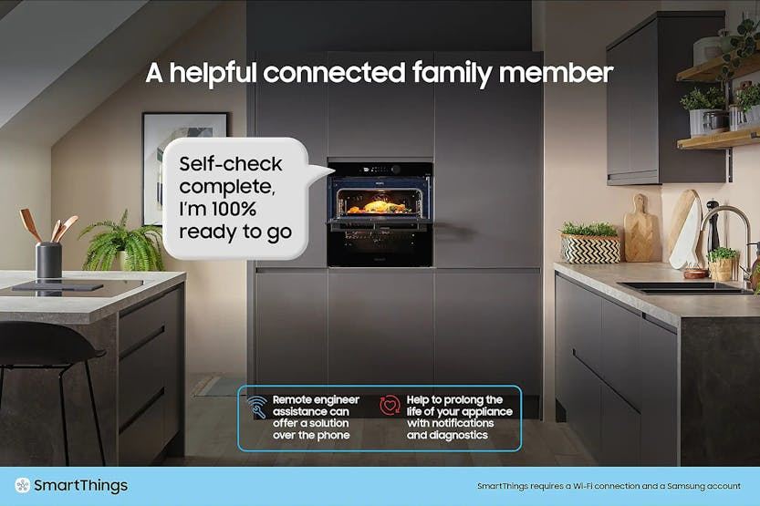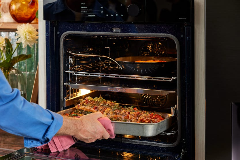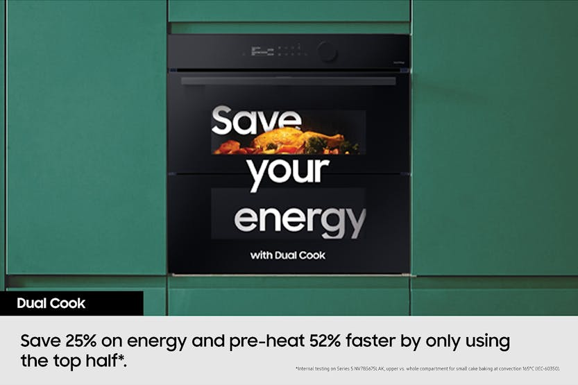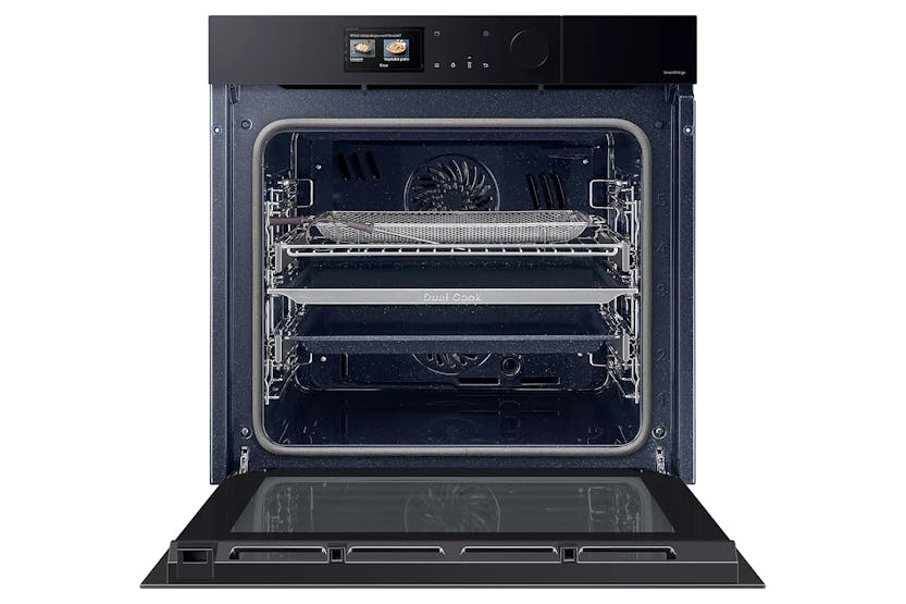 Description Cook More Intelligently AI Pro Cooking Make cooking easy, fun and shareable and enjoy professional results using AI Pro cooking’s artificial intelligence (AI). Auto Open Door Give your home a stylishly simple and seamless appearance that reflects the current trend for clutter-free and clean styling. Dual Cook Steam Enjoy oven cooking and steaming dishes at the same time, or add steam when you are cooking to keep food deliciously moist. More Fun, Less Hassle: AI Pro Cooking* Make cooking easy, fun and shareable and enjoy professional results using AI Pro cooking*’s artificial intelligence (AI). You can remotely view inside and control the oven, and create a time-lapse video as dishes cook. By recognising*** ingredients it recommends recipes and optimises settings. * Only available on certain models.** Available on Android and iOS devices. A Wi-Fi connection and a Samsung account are required.*** A dish should be placed in the center of the oven to achieve the best recognition. The accuracy of the recognition may vary depending on the actual usage conditions, such as the type of ingredients, cleanliness of the cavity and the brightness of the room light. For more detailed information, please refer to the user guide enclosed with the package.∗ This scene is staged and for illustrative purposes only. The images shown may differ from those captured by the actual camera. Look Without Opening: AI Pro Cooking - View Inside Monitor your cooking and control the oven using the SmartThings App* on a smartphone. A view inside internal camera** lets you check on your cooking without frequently opening the door or when you are not home. You can also turn the oven on/off, select functions, set timers and change settings. ** The camera is only operating when the light is on. View Film Highlights: AI Pro Cooking - Film Inside Capture your cooking skills on video and have fun sharing it with friends using social media! The film inside function uses an internal camera* to monitor each dish and create a short video clip** of all the highlights. It automatically adjusts the film speed to capture the key changes. ** Created using only video recorded when the door is closed. After the cooking process ends, it takes about 20 seconds to encode the video in the MPEG file format. Optimised Cooking: AI Pro Cooking - Sense Inside* Save time choosing recipes and serve delicious meals. Using an internal camera**, Sense inside* recognises ingredients and then recommends recipes and optimises settings***. It also monitors how well done food is, so it guides you to cook it properly and alerts you if burning is detected****. *** Based on an AI-created algorithm and not real-time learning. After the ingredients have been identified and the recipe selected, if pre-heating is required, the ingredients need to be removed from the oven during pre-heating. If pre-heating is not required, they can be cooked immediately after they have been identified.**** May not work properly when cooking specific food items that are a dark color or have a cover, which can hinder recognition. So you should also monitor the cooking status yourself. Seamlessly Stylish: Auto Open Door Give your home a simple and seamless appearance. This touch opening oven features a handle-less, flat door design, so it perfectly matches your kitchen style. And with one touch of your fingertip on a button on the control panel, you can open the door* gently and effortlessly. * The door will not open when the button is touched if either Pyrolytic Cleaning or the Child Lock has been activated. Cook & Steam Together: Dual Cook Steam Enjoy oven cooking and steaming at the same time, or add steam to keep food moist. Dual cook steam lets you prepare healthy steamed dishes, while simultaneously oven cooking various foods with different settings. Or use Add Steam when roasting or baking to ensure food is both crisp and tender. Healthy Steam Cooking: Full Steam* Prepare healthy and delicious steamed dishes more easily. Full steam* surrounds foods like vegetables or fresh fish with a vapor of hot steam. So they are cooked optimally and retain their natural flavor and vitamins. It also keeps fat and salt levels low and prevents foods from drying out. Crisp & Tender Food: Add Steam* Get deliciously succulent and crispy food. Add steam* fills the oven with steam to ensure that your food retains more of its natural moisture. So it is always tender and soft inside, but still deliciously crisp outside. And you can easily adjust the amount of steam across 3 levels. One Oven, Three Ways: Dual Cook Choose how you cook different meals to optimise results. Dual cook’s upper and lower zones work independently or together. Use the upper zone for smaller dishes, both together to prepare a variety of dishes with different settings and achieve tasty results, or the whole oven for large dishes. Simply More Intuitive: Modernised Design Enjoy a hassle-free cooking experience with intuitive and personalised control. The modernised design has a stylish control panel with a 4.3"" LCD display, touch control and a single knob. Based on your usage patterns, it shows the most frequently used options, which can be quickly selected. Stylishly Unique: Bespoke Colour Give your kitchen a beautifully stylish and unique look that reflects your personal taste and complements your existing interior design. The oven is available in a variety of modern colours and finishes*. So you can upgrade the appearance of your home by mixing and matching Bespoke appliances. Cooks Using Little Oil: Air Fry Enjoy healthier fried food without a deep fryer. Air fry combines a special tray with hot air circulation that envelops food. It is the ideal way to cook french fries, Tater tots or even vegetables as it eliminates excess fat, but everything is still crispy and brown outside and juicy inside. Totally Even Cooking: Air Sous Vide* Cook food more evenly without it overcooking or drying out. An Air Sous Vi