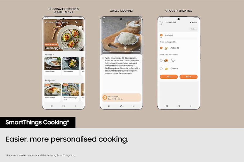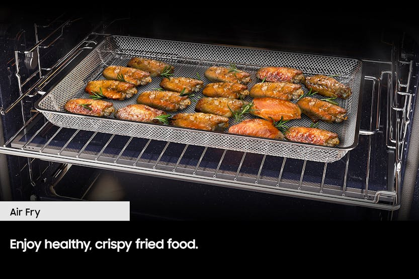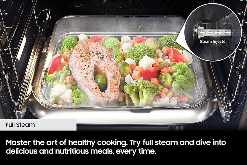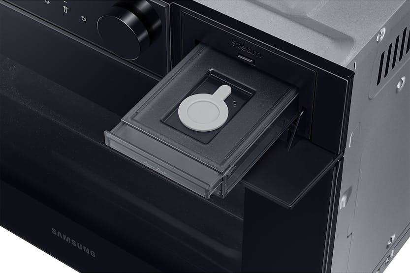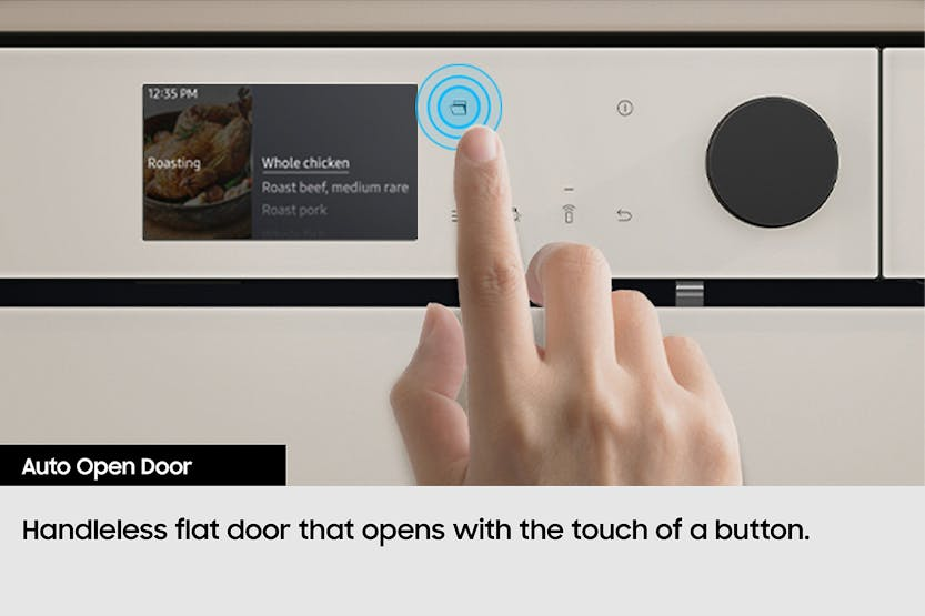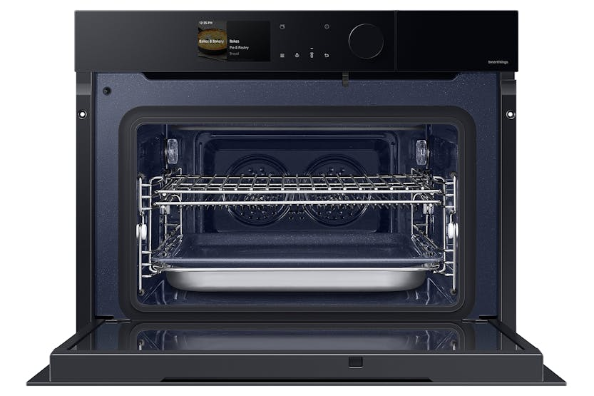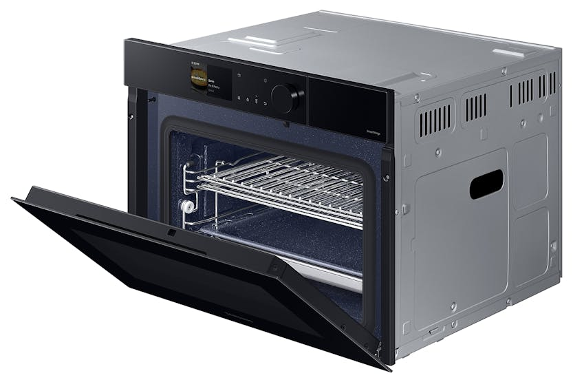 Description More Style, More Flavour Auto Open Door Give your home a stylishly simple and seamless appearance. Steam Combi Optimize the taste and texture of your food, whatever you are cooking, roasting, baking or steaming. Modernised Design Enjoy a simple and hassle-free cooking experience with more intuitive and personalised control. Stylish Convenience: Auto Open Door Give your home a simple and seamless appearance. This touch opening oven features a handle-less, flat door design, so it perfectly matches your kitchen style. And with one touch of your fingertip on a button on the control panel, you can open the door* gently and effortlessly. *The door will not open when the button is touched and either Pyrolytic Cleaning or the Child Lock has been activated. Cook More Ways: Steam Combi* Optimize the taste and texture of your food, whatever you are cooking. With the Steam Combi oven you have much more flexibility. You can use it like a normal oven. Or you can use Full Steam to prepare healthy steamed dishes. And Add Steam makes your food deliciously crisp and juicy. More Healthy & Tasty: Full Steam* Prepare healthy and delicious steamed dishes more easily. Full Steam surrounds foods like vegetables or fresh fish with a vapor of hot steam. So they are cooked optimally and retain their natural flavor and vitamins. It also keeps fat and salt levels low and prevents foods from drying out. Crisp & Juicy Food: Add Steam* Get deliciously succulent and crispy food. Add Steam fills the oven with steam to ensure that your food retains more of its natural moisture. So it is always juicy and soft inside, but still deliciously crisp and brown outside. And you can easily adjust the amount of steam across 3 levels. A Simply More Intuitive Way to Cook: Modernised Design Enjoy a hassle-free cooking experience with intuitive and personalized control. The modernised design has a stylish control panel with a 4.3"" LCD display, touch control and a single knob. Based on your usage patterns, it shows the most frequently used options, which can be quickly selected. Stylishly Unique: Bespoke Colour Give your kitchen a beautifully stylish and unique look that enhances your home. The oven is available in a choice of 3 elegant, modern colour: Clean Navy, Satin Beige and Clean Beige. Simply choose the colour that suits your personal taste and complements your existing interior design. Healthier Fried Food: Air Fry Enjoy healthier fried food without a deep fryer. Air Fry combines a special tray with hot air circulation that envelops food. It is the ideal way to cook chips and vegetables as it eliminates excess fat, but everything is still crispy and brown outside and juicy inside. More Joy, Less Burden: SmartThings Cooking Make your kitchen experience more joyful. SmartThings Cooking* saves time and minimises the burden of cooking. By understanding your needs it recommends personalised recipes** and creates a weekly meal plan. It also offers a guided cooking experience and enables effortless food shopping***. * Requires a wireless network and the Samsung SmartThings App. The Samsung SmartThings App supports Android OS 4.0 (ICS) or later, which is optimized for Samsung smartphones (Galaxy S and Galaxy Note series). This App also supports iOS 7 or later for iPhone models. The SmartThings App is available in the App Store and Play Store.** Available in certain languages. Take Control Anytime: Wi-Fi Connectivity Save time and do more with Wi-Fi Connectivity. Simply monitor and control the oven anytime, anywhere using an App*. It lets you preheat the oven or turn it off. You can also check and adjust the cooking temperature and time or quickly select pre-programmed settings. And it helps you fix errors! * Available on Android and iOS devices. A Wi-Fi connection is required. Easily Cleans Light Soiling in the Oven: Steam Cleaning Get rid of light soiling much more easily. Compared to traditional oven cleaning, Steam Cleaning needs less time, power and effort to remove drips and splashes. It creates steam that loosens food particles, so any residue can be wiped away without scrubbing, leaving the oven sparkling clean. Cook Much More in a Larger Oven Space: 50L Large Capacity Create more and larger dishes with a huge 50 litre capacity oven. It opens up more possibilities in home cooking. You can prepare plenty of different food together, like everything you need for a party. Or it can easily accommodate large items, like a king-size turkey, for a family gathering. Fast, Even Cooking: Dual Fan Save time and cook food more evenly with Dual Fans. Two heated fans distribute heat all around the oven and keep the temperature constant everywhere. It means that dishes are always cooked quickly and thoroughly. So it is great for baking and broiling and you can enjoy tastier meals every time. What's in the Box: 1 x Square baking tray 1 x Square wire rack 1 x Steam tray Air fry rack Product Features: Steam type: Full steam & Add steam Auto programs Air fry Sound on/off Setting (Clock system option (12H/24H)) Upper grill (In/Out): 1400 / 1100 W Lower grill: 1000 W Convection: 1000 W Interior lamp: 25W x 2 Oven door glass: Triple Power consumption (Grill): 2550 W Power consumption (Convection): 2500 W Power consumption (Steam): 2850 W WiFi Embedded Read More