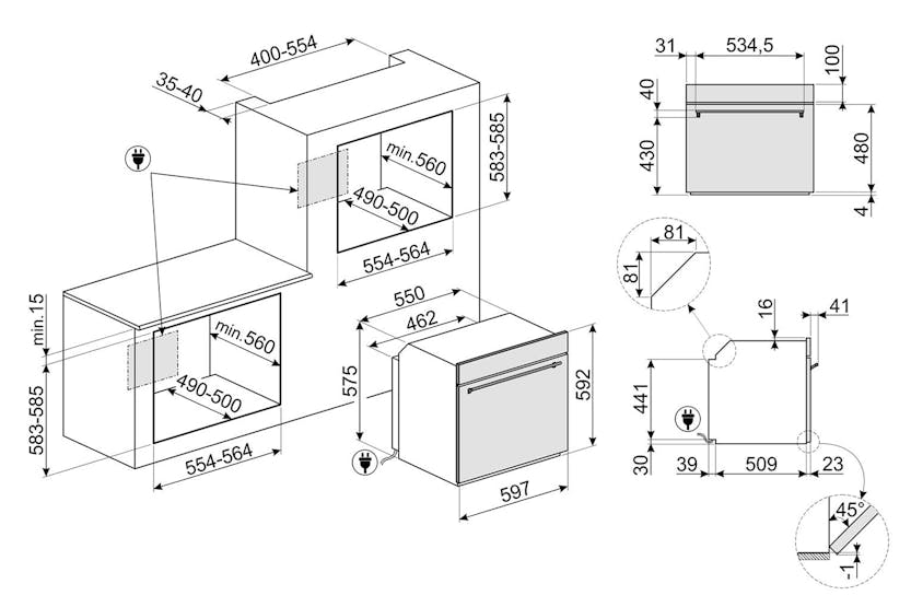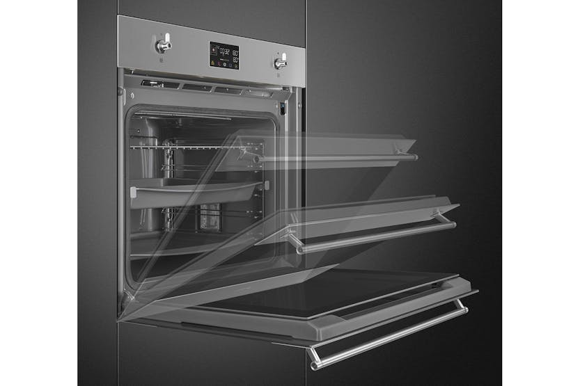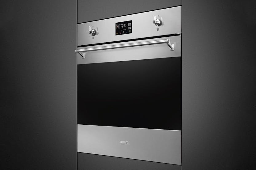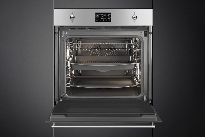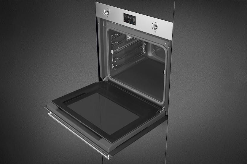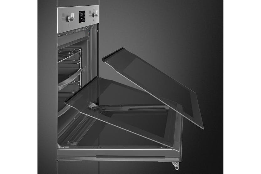 Description Aesthetics: Finishing: Fingerproof Aesthetics: Classic Material: Stainless steel Glass type: Eclipse Door: With 2 horizontal strips Handle: Classic Handle colour: Steel effect Traditional Cooking Functions: Static Base Ciculaire Turbo (circulaire + bottom + upper + fan) Large grill Cooking Functions with Steam: Steam + bottom + upper + fan Steam + circulaire + fan Turbo Grill + fan Other Steam Functions: Tank cleaning Water outlet Water input Descaling Other Functions: Defrost by time Proving Stone cooking BBQ Air-Fry Sabbath Options: Time-Setting options: Delay start and automatic end cooking Timer: 1 Other options: Keep warm, eco light, tones, brightness Showroom demo option Rapid pre-heating Controls lock/child safety Cooking with probe thermometer Technical Features: Display name: Evoscreen Temperature control: Electronic Shelf positions: 5 Shelves type: Metal racks No. of lights: 2 User-Replaceable light Light type: Halogen Light power: 40 W Light when door is opened Door opening type: Standard opening Door: Cool Full glass inner door Total no. of door glasses: 4 Soft open Soft-close hinges Chimney: Fixed Cooling system: Tangential Door lock during pyrolisis Water loading: Drawer, manual Tank capacity: 0,8 l Heating suspended when door is opened Lower heating element power: 1200 W Grill element - power: 1750 W Circular heating element - power: 2000 W Performance / Energy Label: Energy consumption in conventional mode: 3.92 MJ Energy consumption per cycle in conventional mode: 1.09 kWh Energy consumption in forced air convection: 2.45 MJ Energy consumption per cycle in fan-forced convection: 0.68 kWh Product Features: Galileo technology: Pyro steam Control knobs: Classic Steam range: 20 - 40% Cooking method: Combi steam Power supply: Electric Control setting: Knobs & touch buttons No. of controls: 2