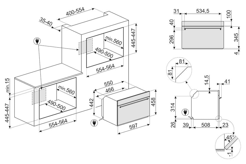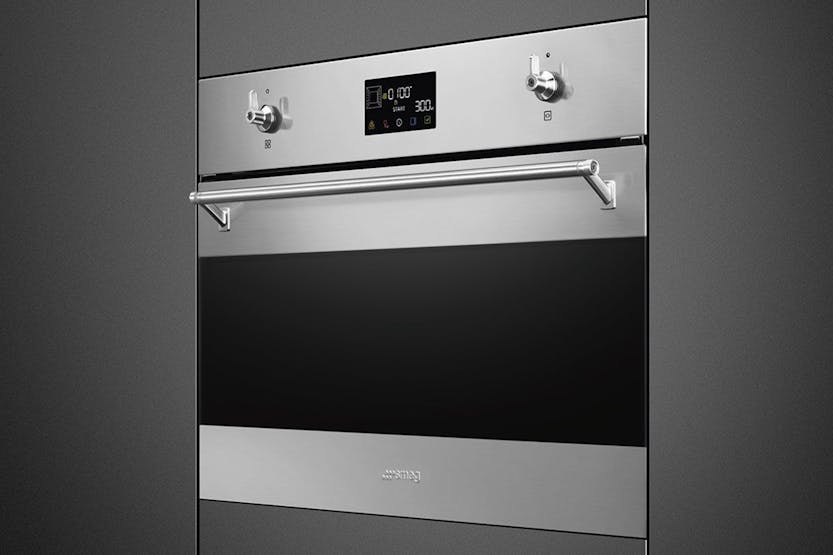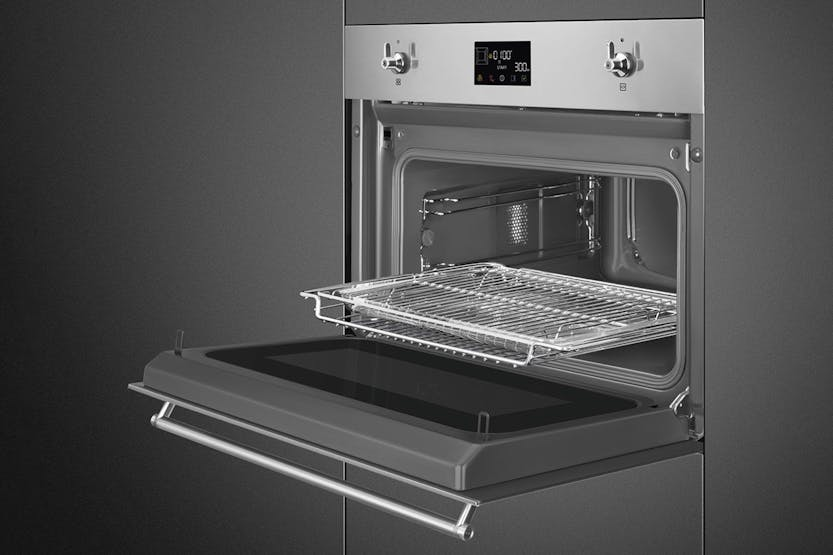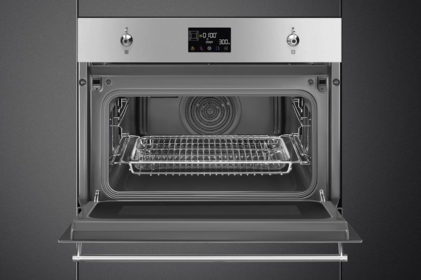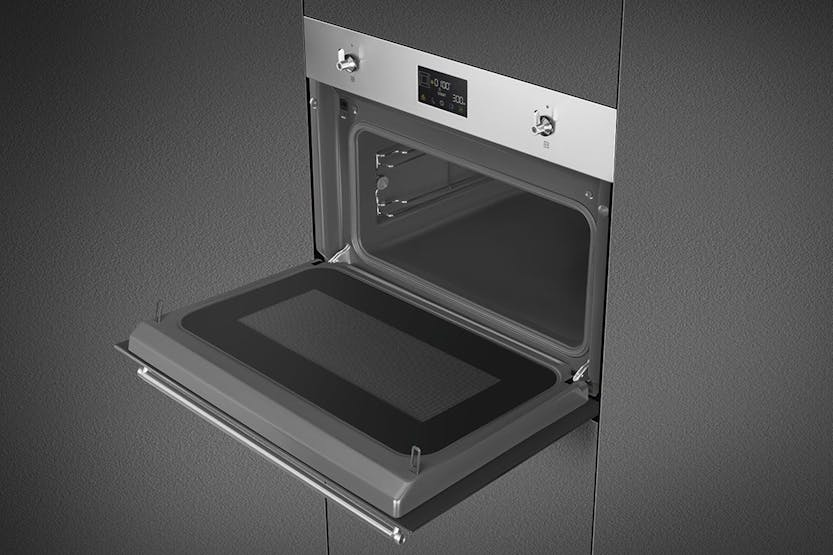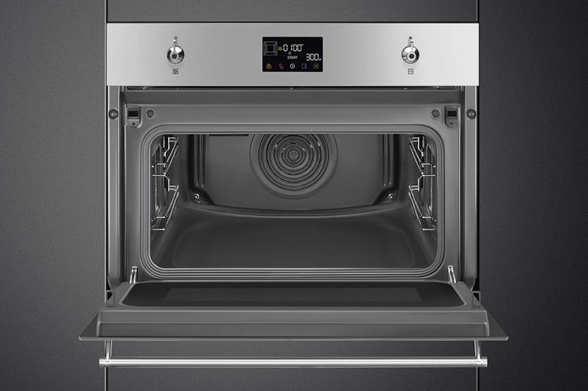 Description Aesthetics: Aesthetics: Classic Material: Stainless steel Finishing: Fingerproof Type of steel: Brushed Glass type: Eclipse Door: With 2 horizontal strips Handle: Classic Handle colour: Stainless steel Traditional Cooking Functions: Static Fan assisted Ciculaire Turbo (circulaire + bottom + upper + fan) Large grill Base Microwave Functions: Microwave Microwave + bottom + top + fan Microwave + circulaire + fan Microwave + grill Other Functions: Defrost by time Proving Stone cooking BBQ Air-Fry Sabbath Options: Time-Setting options: Delay start and automatic end cooking Minute minder Timer: 1 Other options: Keep warm, eco light, tones, brightness Showroom demo option Rapid pre-heating Technical Features: Display name: Evoscreen Temperature control: Electronic Shelf positions: 2 Shelves type: Metal racks No. of lights: 2 Light type: Halogen Light power: 40 w Light when door is opened Microwave effective power: 850 w Door opening type: Standard opening Door: Temperate door Total no. of door glasses: 4 Soft open Soft close hinges Chimney: Fixed Cooling system: Tangential Microwave screen protection Microwave stops when door is opened Heating suspended when door is opened Lower heating element power: 1200 w Grill element - power: 1750 w Circular heating element - power: 1400 w Product Features: Cooking method: Combi microwave Galileo technology: Micro combi Power supply: Electric Controls colour: Steel effect Power supply cable length: 115 cm