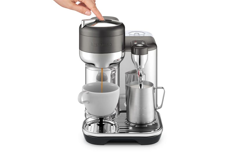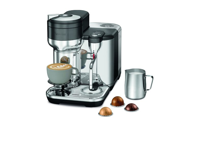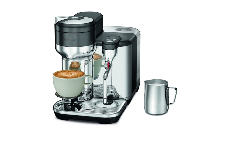 Description Online Only Unleash your inner barista with Sage the Vertuo Creatista Black Stainless Steel , a cutting-edge Nespresso coffee machine, known for its unparalleled performance. Made to stand out with its seamless beauty merged with top-grade functionality, this coffee machine promises a superior brewing experience in every cup. Flaunting a wide range of coffee options, the Creatista caters to every coffee lover’s palate; be it a heady black coffee or quirky milk-based recipes. Concoct your favourites, from decadent Flat Whites to classic Cappuccinos, or jazz up your cuppa with detailed latte art, made easy with the integrated steam wand. Select from the three varying milk textures and temperatures, ensuring coffee and milk blended exactly to your taste. Boasting Intelligent Brewing Technology, just one touch delivers accident-proof Espresso, Double Espresso, Gran Lungo, Mug or Carafe. Each Nespresso Vertuo pod houses a unique code, so every brew is perfected without fail. And when the mood swings towards milk-based concoctions, a double click delivers a shortened extraction suited to pristinely blend with frothy milk. From the delectable Flat White, Cappuccino and Caffe Latte, to the artistic Latte Macchiato, the Creatista brings limitless coffee recipes to your domestic playground. Craft café-quality textured milk with the state-of-the-art Auto MilQ tech- featuring three temperature and texture settings. This hands-free steam wand is self-purging, another feature to enhance convenience. Crafted in a premium-grade, brushed and polished stainless steel, the Sage Creatista will effortlessly melt into your kitchen setting. Its novel design includes a compact drip tray that incorporates a small cup holder, perfect for smaller drinks. This removable drip tray gives room for larger containers, allowing direct brewing into your travel mug or your Nespresso carafe. Besides elegant cafe-quality coffee at home, the Vertuo Creatista brings you A-grade machine connectivity through WiFi and Bluetooth. Keep up with the latest coffee innovations, order capsules, receive real-time tips on using your machine, and get alerts for maintenance. Let no detail slide past, because your coffee is of unparalleled importance. Features include: Control type: Buttons Milk Frother: Steam Wand Variable cup size: Yes Removable reservoir: Yes Programme assistance: Rinsing, Cleaning, Descaling Dishwasher safe parts: Yes Five coffee and milk-based drink options 3 Milk Temperature settings 3 Milk Texture levels Variety of brew sizes- Espresso, Double Espresso, Gran Lungo, Mug, Carafe Milk jug included WiFi and Bluetooth Connectivity Removable Drip Tray for different sized cups Auto MilQ hands-free milk texturing tech and self-purging after each use This stylishly efficient coffee machine perfectly expresses the essence of the Sage brand's philosophy - Exploring the domain of limitless coffee crafting, blending form with function so that elegance in every detail enhances our most sacred rituals- our first cuppa. It was created to capture the spirit of artisanal coffee in the comfort of your home while providing an elevated user experience. An unmatched addition to any connoisseur’s collection, Sage the Vertuo Creatista Black ensures Italian café adventures right at your Kitchen counter.