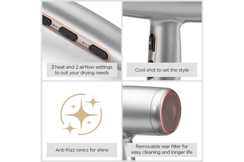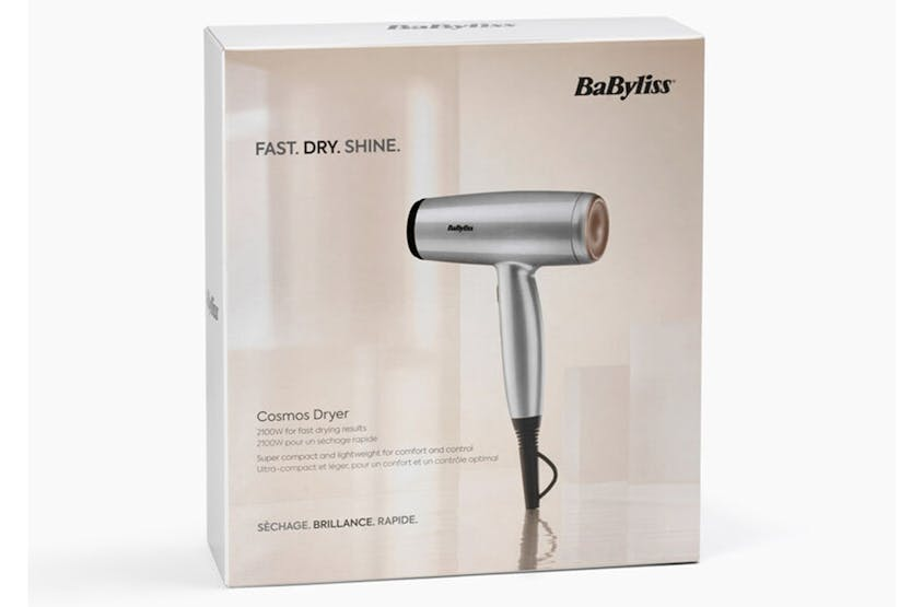 Description Experience fast drying results with the ultra-slim, lightweight Cosmos Hair Dryer. Its compact size delivers powerful airflow for a fast blow-dry, with easy handling and control. Smoothing Ionics The anti-frizz ionics smooth your hair as you dry, for a sleek, shiny finish. Custom Styling With 3 heat and 2 airflow settings, plus a cool shot button, it will provide the right combination to suit your hair needs. Use the slim concentrator nozzle for sleek, straight styles or attach the large diffuser to enhance curls, boost volume, and define natural texture, without the frizz. Part of BaByliss Cosmos Collection. Product Features: Ionic-frizz control Large diffuser Slim concentrator nozzle Removable rear filter 2 Airflow settings