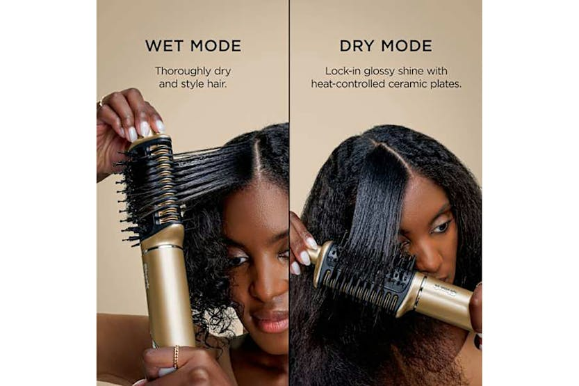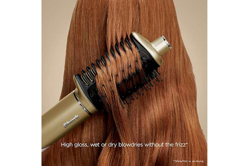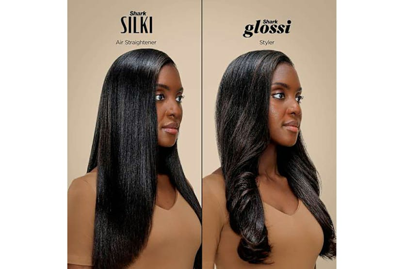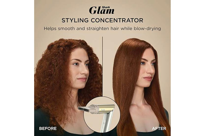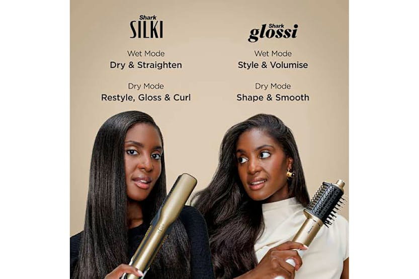 Description Premium multi-styler & dryer with heat-controlled ceramic and high-speed airflow with four styling tools. Glossy, Shiny Hair Gloss Lock technology seals in shine on dry hair for styles that last all day. Silki Tool Heat-controlled ceramic and high-speed airflow provides a silky-smooth finish on wet or dry hair, with up to 2x more shine** Glossi Hot Tool & Air Glosser High gloss, wet or dry blow dries without the frizz**. Smooth, stretch and create bounce for all hair types. Auto-Wrap Curlers Easily wraps, sets & curls automatically without heat damage in minutes. Styling Concentrator Tool Controls directional airflow for a sleek, smooth finish or blowout. Includes Silki tool, Glossi tool, Auto-wrap curlers, concentrator and main unit. Styles for All Premium styling for both wet-to-dry and dry restyling. Salon-inspired Create salon-inspired looks with four styling attachments. Super Smooth The silki tool gives a smooth finish, without heat damage* *In wet-to-dry mode. Perfect Curls Wrap and set curls like a pro with the auto-wrap curlers. Introducing the shark glam multi-styler, designed to deliver ultra-fast drying with no heat damage*. It offers a combination of heat controlled ceramic and powerful air to achieve glossy blow dries, silky straight styles, and voluminous curls. With four versatile styling tools included, it’s your all-in-one solution for salon-inspired results at home. At the heart of the shark glam multi-styler is gloss lock technology, which seals in shine on dry hair for a smooth, radiant finish that lasts all day**. The silki tool acts as both a hot tool and air straightener, delivering a silky, frizz-free look without heat damage*—perfect for wet-to-dry styling, touch ups and dry restyling. For wet or dry blow dries, the glossi tool & air glosser ensures high-gloss results without the frizz***, making it ideal for transforming all hair types. The styling concentrator tool gives you precision control over airflow, allowing you to create sleek finishes or volume with ease. And for curls, the auto-wrap curlers automatically wrap, set, and curl your hair in minutes. This styling system is suitable for all hair types, making it a versatile addition to any beauty routine. Finished in a luxurious gold colour, the shark glam multi-styler is as stylish as it is functional. It includes everything you need: hair dryer, styling concentrator, auto-wrap curlers, silki tool, and glossi tool. Whether you're aiming for straight, wavy, or curly looks, this multi-styler delivers high-shine results with minimal effort and maximum care. Experience the future of styling—fast, glossy, and without heat damage*. Notes: *In wet-to-dry mode. *71% of 156 users agree in consumer study **Shine/frizz vs air drying What's in the box Auto-wrap curlers Styling concentrator Silki straightening tool Glossi blow-dry tool Product Features: Weight: 1.46 kg Dimensions: 42.9mm L x 40.9mm W x 273.8mm H