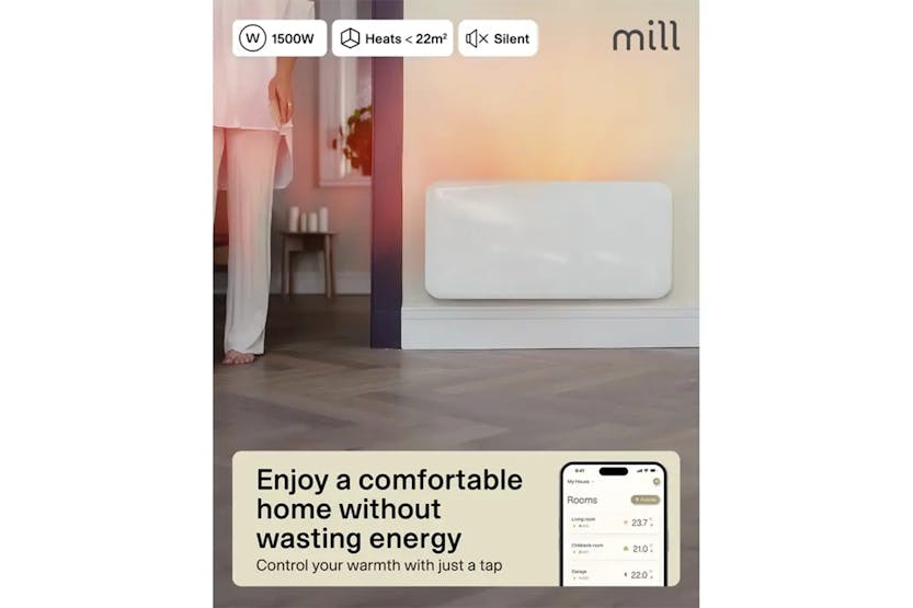 Description Check out the video: Mill Invisible Smart WiFi Panel Heater generation 4 is a high-tech and energy-efficient panel heater with a clean, modern look that blends seamlessly into all types of homes. With support for Matter, Zigbee 3.0 and WiFi, this is one of the most future-proof heaters on the market – ready for the smart home, whatever platform you use. In the Mill app, you can easily control the temperature from anywhere and see your power consumption at all times. With the weekly program, the temperature will automatically adapt to your daily routines, ensuring optimum comfort and avoiding unnecessary power consumption when you’re away or asleep. The heater is equipped with Mill Predictive Heating and Mill PID Wattage Tech, which uses machine learning and precise power control to keep the temperature stable with the lowest possible power consumption. You get an energy-efficient and comfortable heating experience that adapts to your habits and the needs of the room. The elegant, rounded front and sleek design make it blend in with the wall. The panel heater provides comfortable heat, is quiet, has a low surface temperature, can be safely left on unattended, and is IPX4 approved for use in bathrooms. Mill Pid Wattage Tech First panel heater with PID control heating technology. When desired temperature is reached, the heater will maintain this temperature by lowering the power level, resulting in a more stable heating with less fluctuation in temperature. Mill Predictive Heating The panel heater will heat the room so that the desired temperature is reached at a specific time. The heater learns how fast the room goes up/down in temperature over time. That way, it will know when to start heating to achieve your desired temperature at the time you have scheduled in the Mill-app. Easy Connection Seamless and easy connection with Bluetooth that automatically connects the device to your WiFi-network, regardless of the type of router you have. Silent Operation Mill WiFi panel heaters are silent when operating, which means there is no clicking sound when the temperature goes up and down. Child Safety Lock Activate the child lock in the Mill app to lock all buttons on the control panel of the heater. This prevents nosy little fingers from adjusting the temperature or turn the heater on and off. Commercial Lock Ensures that you as a landlord have control over the temperature and electricity consumption in the rental properties in the Mill app. The World’S First Panel Heater with Matter Mill WiFi generation 4 panel heaters now come with Matter support, so you can control the temperature in the same app as your other smart home products, if you wish. With Matter you can now easily regulate the temperature with voice control via Amazon Alexa, Apple Home and Google Home. All Mill WiFi products (except Gen 1) can also be controlled via Homey. Safety & Installation Easy to install yourself Wall bracket and screws included Cord length: 1300 mm right side Safe to leave unattended Bathroom approved: IPX4 Overheat protection Child safety lock Commercial Lock Connectivity Easy connection to WiFi via Bluetooth 5.2 Connectivity: WiFi 2.4 Ghz (WiFi 6). Zigbee 3.0 Integrations: Matter (Google Home, Apple Home, Amazon Alexa etc.), Homey, Tibber Local REST API Open API Product Features: Complements the modern home Energy efficient: Reduced energy consumption Power: 1500W Recommended room size: 18-22 m² Matter compatible LED Display for easy reading Heating element: X-aluminium – high efficiency, low surface temperature (max. 55 °C) Fast and even distribution of heat in the whole room Low energy control Mill PID Wattage tech Mill Predictive heating Open window function Silent operation Dimensions: 850 x 210 x 445 mm (W x D x H) Read More