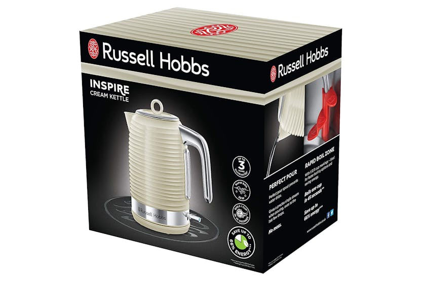 Description If you’re looking to add a touch of uniqueness to your kitchen, the Cream Inspire Kettle offers style as well as performance. By combining a cream premium textured high gloss finish with stunning chrome accents; this kettle is the perfect match for tasteful interior. So, wake up and kick-start your morning routine with that much needed cup of tea, or have family and friends over for a cuppa and a catch-up and relish in the compliments received about your new Cream Inspire Kettle. Check out the video: Illuminated Power On/Off Indicator When boiling, the water window glows blue, bringing a gentle illumination to your kitchen. This kettle creates a calming atmosphere, just what you need on those mornings that can often be quite hectic. Perfect Pour The Inspire Kettle is designed with a perfect pour spout that creates a streamlined flow of water straight from your kettle to your cup talk about bliss. Rapid Boil One Cup in 45 Seconds The Inspire Kettle allows you to measure the perfect amount for one cup using a rapid boil zone feature. By boiling one 235 ml cup of water in just 45 seconds means it’s never too late for that last cup of tea. 3000W With the Cream Inspire Kettle you’re guaranteed power as well as the stunning design. So whether it’s that first cup of tea in a morning that you crave to prepare you for the day or you’ve been stuck with the brew round for the whole family, the Cream Inspire Kettle can cater for anyone and everyone. So whether it’s tea for two, or tea for a few, the Inspire Kettle will leave you with more time to sit back, relax and enjoy. Product Features: Easy view water gauge Pull off lid 360° base with cord storage Boils 1 cup in 45 seconds Removal, washable anti scale filter Blue power light indicator Saves up to 66% energy** Illuminated power on/off indicator Premium textured plastic high gloss kettle with chrome accents