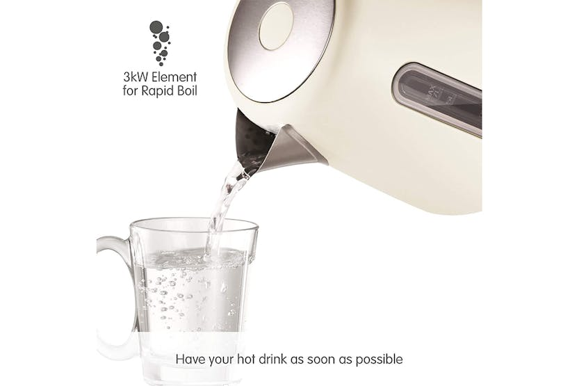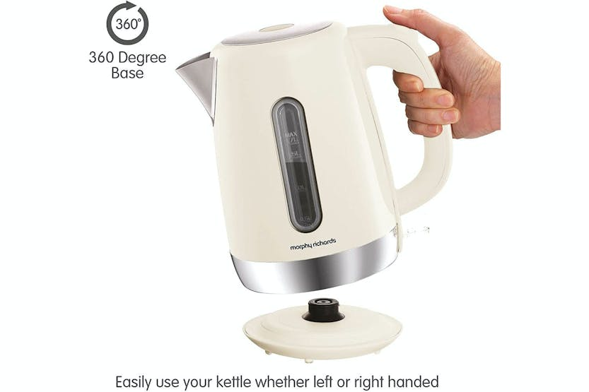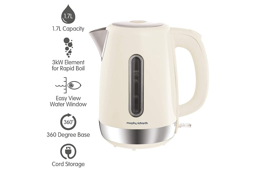 Description Check out the video: The Morphy Richards Equip cream stainless steel jug kettle has a stylish finish and is available in 4 stunning colours. With illumination, easy view water gauge and a 1.7L capacity to make up to six cups at once, this kettle has all the functionality you require. It also features a 3kW concealed element for rapid boil, a 360° base for right or left handed use, and a removable limescale filter for clear water. For safety, the kettle also offers boil-dry protection and cord tidy. 1.7 Litre Capacity The generous 1.7 litre capacity tank means you can boil water for up to 6 drinks at once, saving time and energy. 3Kw Element Rapid boil means your hot drinks are ready in no time, thanks to the powerful 3kW element. Easy View Water Window Allows you to easily view the contents of your kettle, and only boil what you need - wasting less energy. 360 Degree Base Easily remove and replace your kettle in any direction, whether you are left or right handed. Cord Tidy The base cleverly conceals any excess wire, so that your kitchen side is always mess-free. Limescale Filter The spout includes a limescale filter, ensuring your hot drink is perfect every time. Product Features: Cord storage Boil dry protection Concealed element 360 degree cordless base Removable limescale filter Water level Indicator easy view