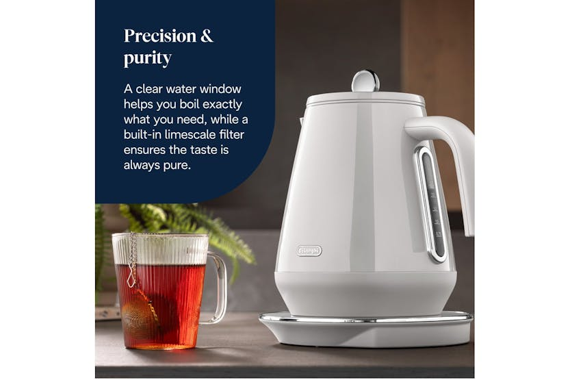 Description Eclettica SpecialTea Live your uniqueness and Ecleticism from the early morning with the Eclettica collection. A perfect blend of advanced functionality and elegant design, this kettle is the ideal solution for tea lovers who desire a personalized and high-quality brewing experience Digital Temperature Control 9 Adjustable temperature setting (40°-50°-60°-70°-80°-85°-90°-95°-100°). 30 Minutes keep warm function and 4 level system sound regulation options. Cordless Kettle Cordless kettle for maximum freedom to use: it can be placed on the independent base in any position (360°). Non-slip feet. Assured Water Purity and Perfect Pouring The removable and washable limescale filter ensures water purity. The spout is designed to ensure perfect, splash-free pouring. Fast and Efficient Boiling Powerful concealed heating element to rapidly bring water to boil. The built-in water level indicaor ensures you boil just what you need – minim fill capacity: one cup (0,3L) The difference between a decent cup and a perfect brew? Just a few degrees. From breakfast blends to delicate greens, every tea has its ideal brewing temperature, and coffee is no different. Slightly too hot and you could scorch delicate flavours. A little too cool and you’ll miss its full complexity. The little things in life are worth fighting for, and that starts with a perfectly brewed, perfectly hot cup at any time of day. So DeLonghi designed a kettle to honour every tea leaf and coffee bean, with nine precise temperature settings for every brew DeLonghi could think of. It can even hold your set temperature for 30 minutes if you need to come back to it. Taste your tea as it's meant to be tasted. Product Features: USP: Digital variable temperature control (9 temp settings ranging from 40-100°C), Keep warm function Volumes setting: 4 Finishing: Glossy metallic Measuring method: Water window with L markings from 0.75L Nine precise temperature settings from 40-100°C Quick to boil with capacity for up to seven cups Keep warm function holds temperature for up to 30 minutes Sleek painted stainless steel body and integrated touch controls Removable lid and built in limescale filter keeps your brews pure Metal wrapped touch points Precious glossy finishing with chromed details Detachable base for cord-free convenience Special bottom cover finish Digital temperature control Read More