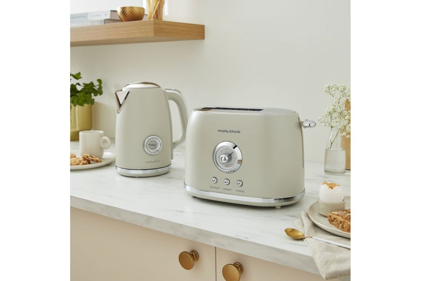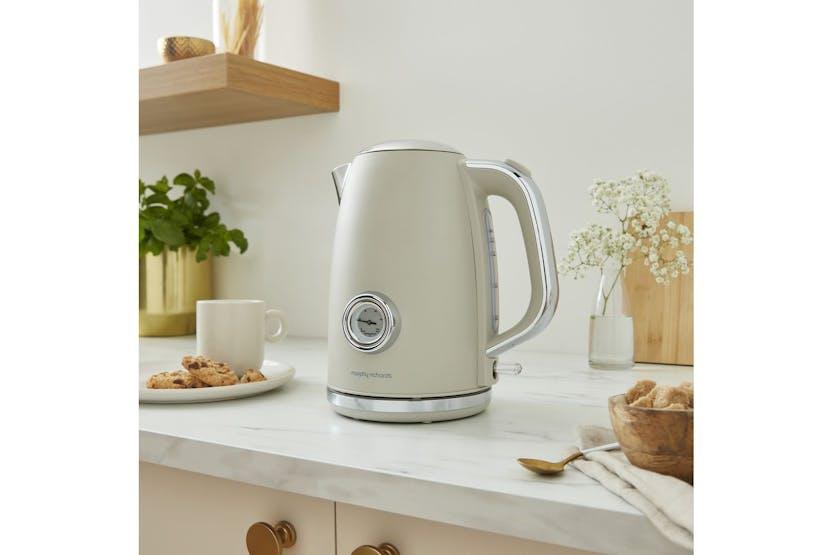 Description Online Only Have coffee in style with the Morphy Richards Colour Boutique Kettle. This high-end appliance brings to your kitchen a unique blend of retro glamour, modern design, and excellent functionality. Ideal for the stylish and stat-of-art Irish kitchens, this Kettle estate ensures unrivalled efficiency while establishing sophistication. Its aesthetic homesteader comes in a striking Porcini Mushroom Matt Steel colour variant, heightening style consciousness within your kitchen. Thriving on vintage appeal, this Kettle features a classic front temperature dial earning it a distinctive charm. You can prepare up to 6 hot drinks at once, owing to the generously large 1.7L capacity. Enhanced with a 3kw element, you are assured of rapid boiling making a quick cup is never a hassle. A unique aspect of this appliance is the blue indicator light conveniently notifying you of the boil's progress. Safety is a concern well handled by Morphy Richards, integrating auto shut off facility and boil dry protection in this Kettle. Compounding convenience, the 360° base makes it multidirectional and the cord storage ensures a clutter-free counterspace. This Kettle attests to secure operation, modernization while preserving a vintage charm. Trust the Morphy Richards Colour Boutique Kettle to standout while expeditiously catering to your hot drink preparations, living up to its reputation of mixing vintage charm with modern efficiency. In simpler terms, it's not just a kettle; it's a statement of style to add a touch of old-world charm to your modern kitchen! Product Features: Porcini mushroom matt steel Body Material 1.7 L Water Capacity Large capacity to make up to 6 hot drinks at a time Auto Shut Off and Boil Dry Protection Blue LED Indicator Retro Style Temperature Control 3kW Element for Rapid Boiling 360° Base for ease of use Convenient Cord Storage