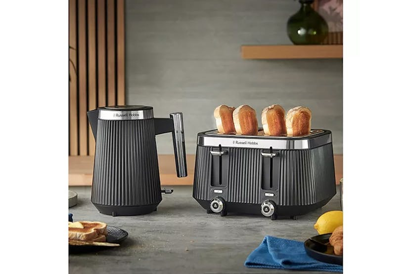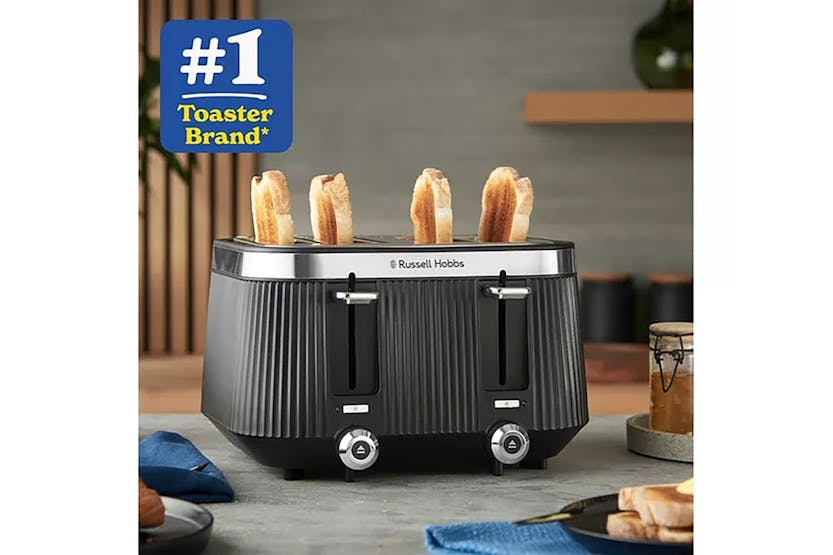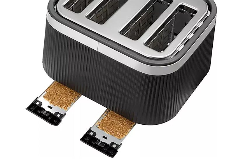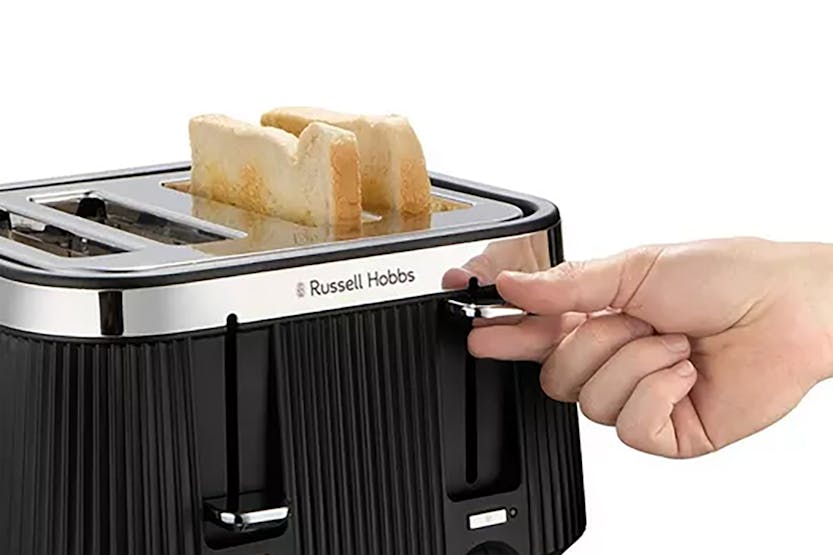 Description With distinctive stainless-steel accents and an eye-catching matte black fluted design, the Russell Hobbs Bronte 4 Slice Toaster Matte Black is designed to stand out. Check on your slice without stopping the cycle with the Lift and Look feature and raise toast with the help of the high lift feature. The frozen, reheat and cancel functions allow you to create the perfect golden crunch, and the indicator light will glow until the pop. Bronte Toaster – Where Style Meets Functionality An elegant matte black fluted exterior sits in contrast to the brushed stainless-steel trim making the Russell Hobbs Brontë 4 Slice Toaster Matte Black a stylish addition to your kitchen worktop. Check to see if your slice is just how you like it without stopping the cycle with the Lift and Look feature. And the high lift lever lets you retrieve smaller snacks like bagels without risking your fingers in the heat. Whether you forgot to get your bread out of the freezer, or you’ve let your bagel go cold, there’s a setting to help you toast the perfect breakfast with the frozen, reheat and cancel functions. The indicator light shines until your perfect slice pops, so you’ll know when your snack is ready. Distinctive Design A fluted matte black casing with distinctive stainless-steel accents and controls gives this toaster the wow factor. Lift and Look Lever Raising the Lift and Look lever allows you to check your toast mid cycle without resetting the timer, so you can always enjoy your snack just how you like it. Frozen, Reheat and Cancel Settings Forgot to get your bread out of the freezer or left your bagel to cool for too long? We’ve got you – the frozen/reheat/cancel functions leave your toasted goodies just how you like them every time.