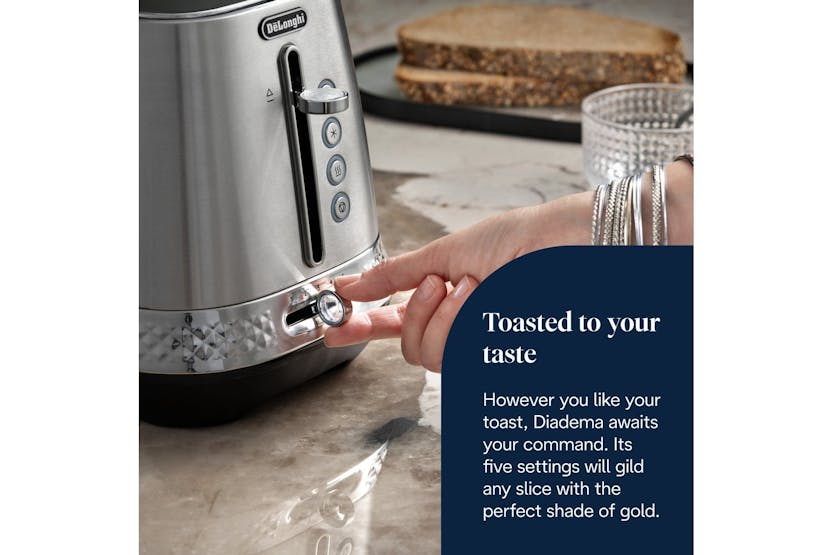 Description Turn your daily routines into luxury experiences with the Diadema breakfast collection. The perfect mix of style and functionality, this timeless Platinum-coloured long-slot toaster is masterfully modelled to add an elegant touch to your kitchen, with an array of settings, adjustable progressive browning controls and long slots to fit any slice. Browning Controls Create breakfast treats to everyone’s individual preferences with electronic pre-set toasting functions,including defrost,reheat,bagel and cancel,with progressive browning controls. Crumb Tray Convenient cleaning thanks to the fully removable crumb tray,preventing breadcrumbs from building up in the toaster and keeping your worktop neat and tidy. Extra-Lift Position Raise up and remove smaller slices easily using the toaster's practical extra-lift position. Product Features Toast to your tastes with progressive browning, reheat, bagel and defrost settings Fit a wider variety of baked goods with long toaster slots Easily remove small slices using the extra-lift position Keep your worktops tidy thanks to the removable crumb tray Elegantly designed kettle in striking Onyx Black Finishing: Glossy Control method: Button